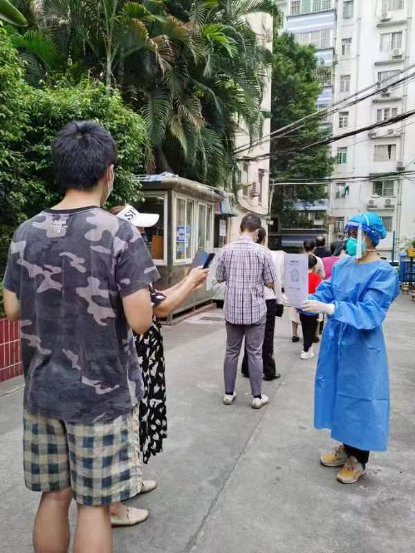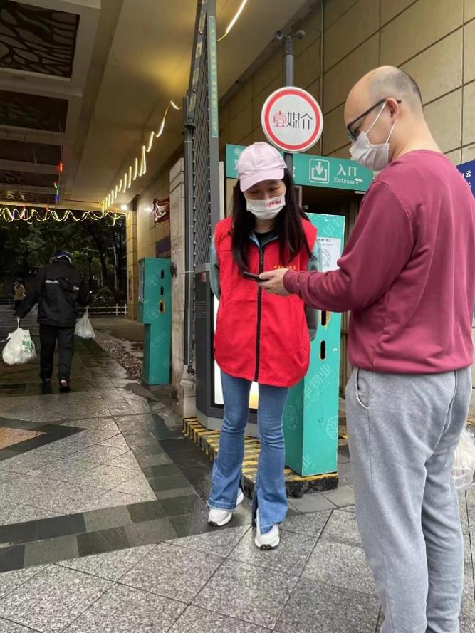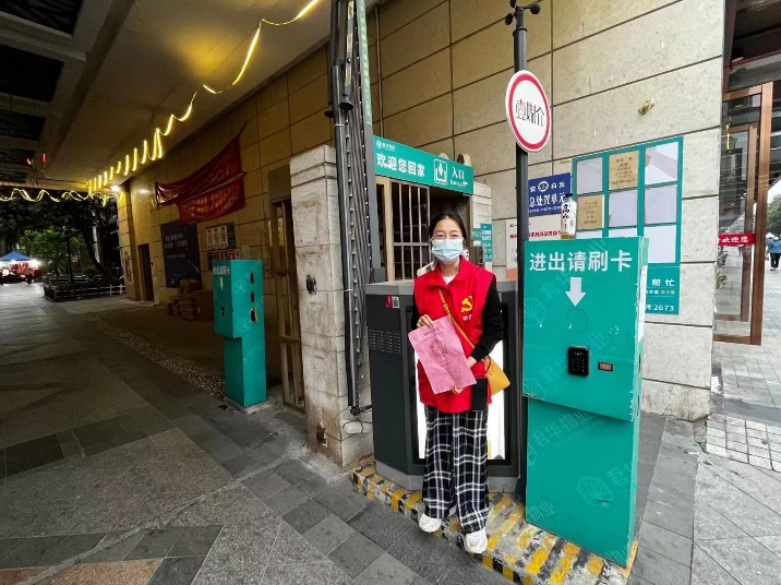 11月份,学校党委发出了倡议书,经贸学院党员教师刘佳珺所在的社区在白云区低风险区,但周边不断有零星的病例出现,社区的防疫压力很大。作为志愿者,她在小区大门前指引来往居民扫场所码通行,提醒居民必须戴口罩进入小区,检查黄码和七天未核酸检测人员。