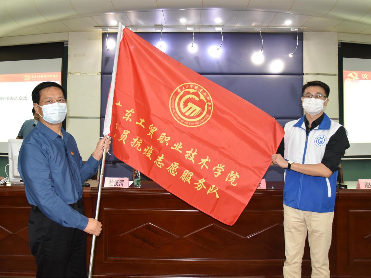 学校党委副书记、校长何汉武向志愿队队长李繁授旗