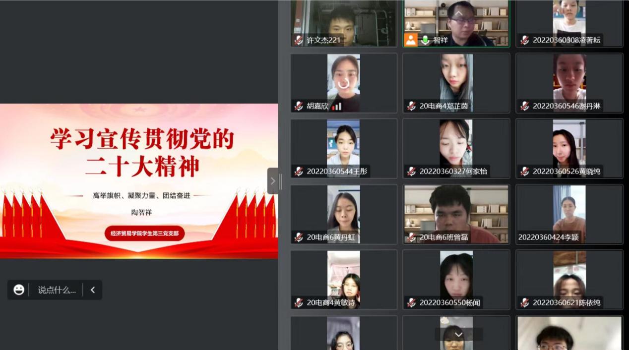 根据学校党委《开展党的二十大精神宣讲行动的实施方案(粤工贸院党字〔2022〕59号)》的通知精神,12月6日晚上,学校党的二十大宣讲团成员、经济贸易学院学生第三党支部书记陶智祥在支部开展了党的二十大精神宣讲活动。