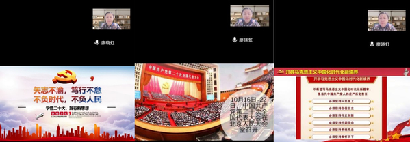 为深入学习贯彻党的二十大精神,2022年12月8日上午,经贸学院教师第一党支部书记、20电商5班班主任廖晓虹根据学校党委的部署安排,通过线上会议方式在班级同学中开展党的二十大精神宣讲。