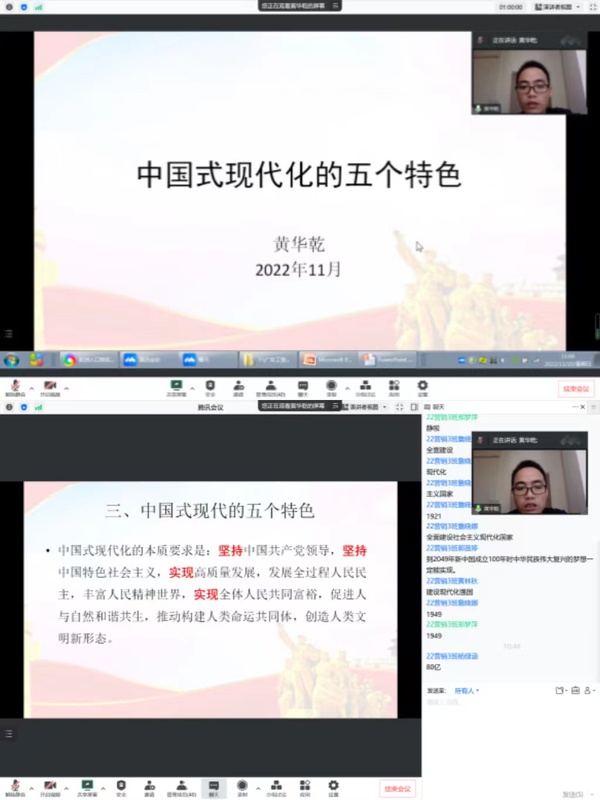 为深入学习宣传贯彻党的二十大精神,根据《中共新葡的京集团8814vip委员会关于开展党的二十大精神宣讲行动实施方案》要求,鉴于当前疫情防控形势,11月20日上午,学校党的二十大精神宣讲团成员、经贸学院党员博士教师黄华乾通过线上宣讲的方式,以题为《中国式现代化的五个特色》向经济贸易学院22营销3班全体学生宣讲党的二十大精神。