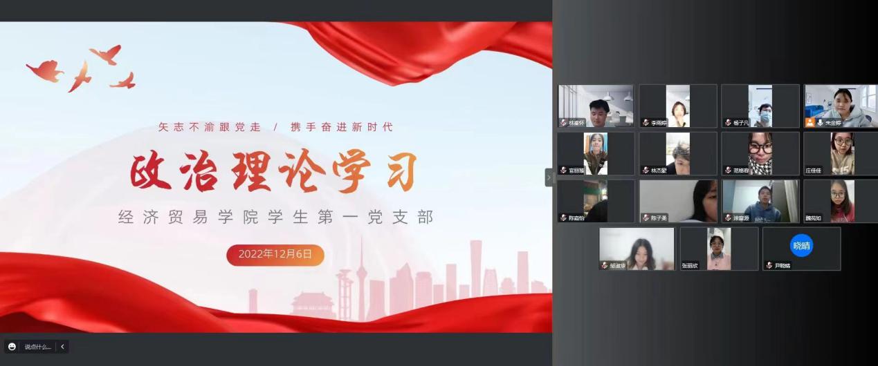 12月6日,经济贸易学院学生第一党支部、学生第二党支部、学生第三党支部分别采取线上的会议形式收听观看江泽民同志追悼会、《习近平谈治国理政》第四卷、习近平在党的二十大上的重要讲话精神和党的二十大精神,并结合理论开展业务学习。会议由支部书记吴海英、陈晓艳、陶智祥主持,支部全体党员参与了学习。