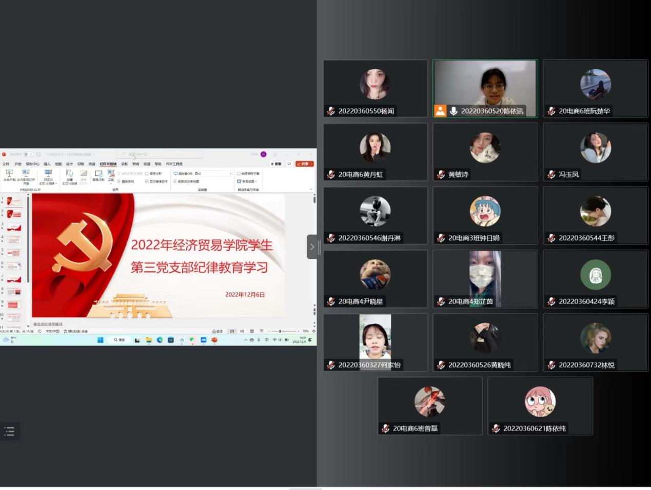 12月6日,经济贸易学院学生第一党支部、学生第二党支部、学生第三党支部分别采取线上的会议形式收听观看江泽民同志追悼会、《习近平谈治国理政》第四卷、习近平在党的二十大上的重要讲话精神和党的二十大精神,并结合理论开展业务学习。会议由支部书记吴海英、陈晓艳、陶智祥主持,支部全体党员参与了学习。
