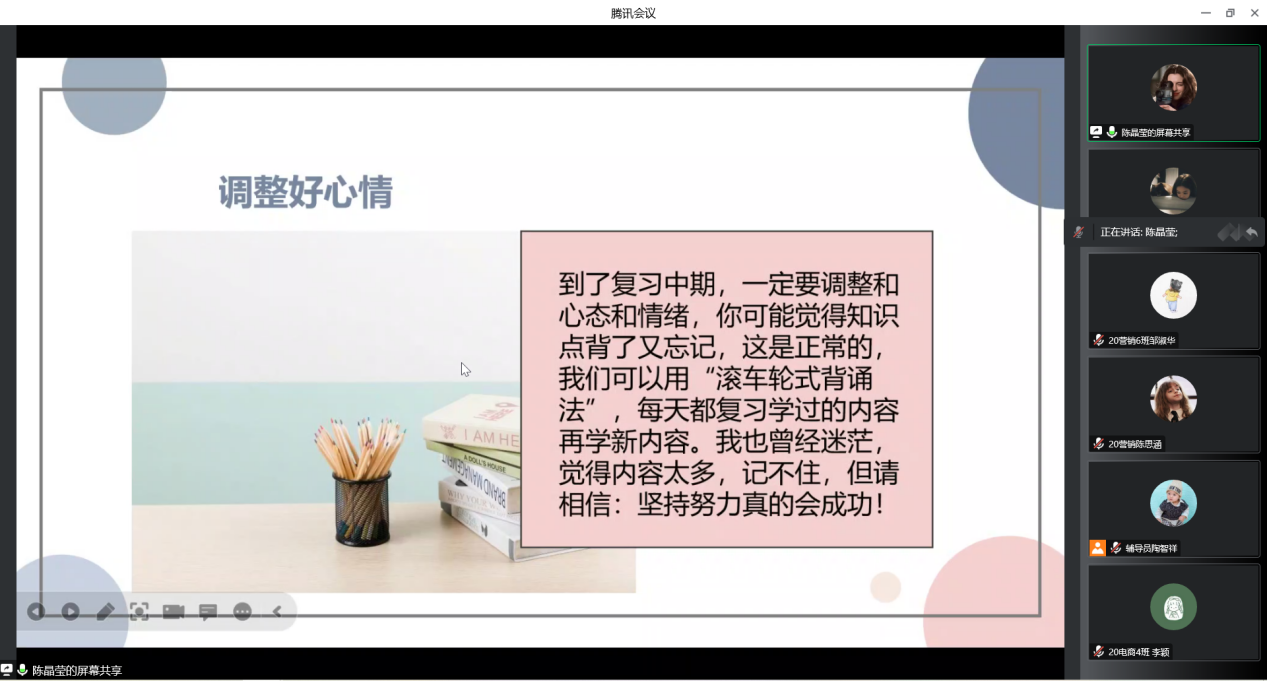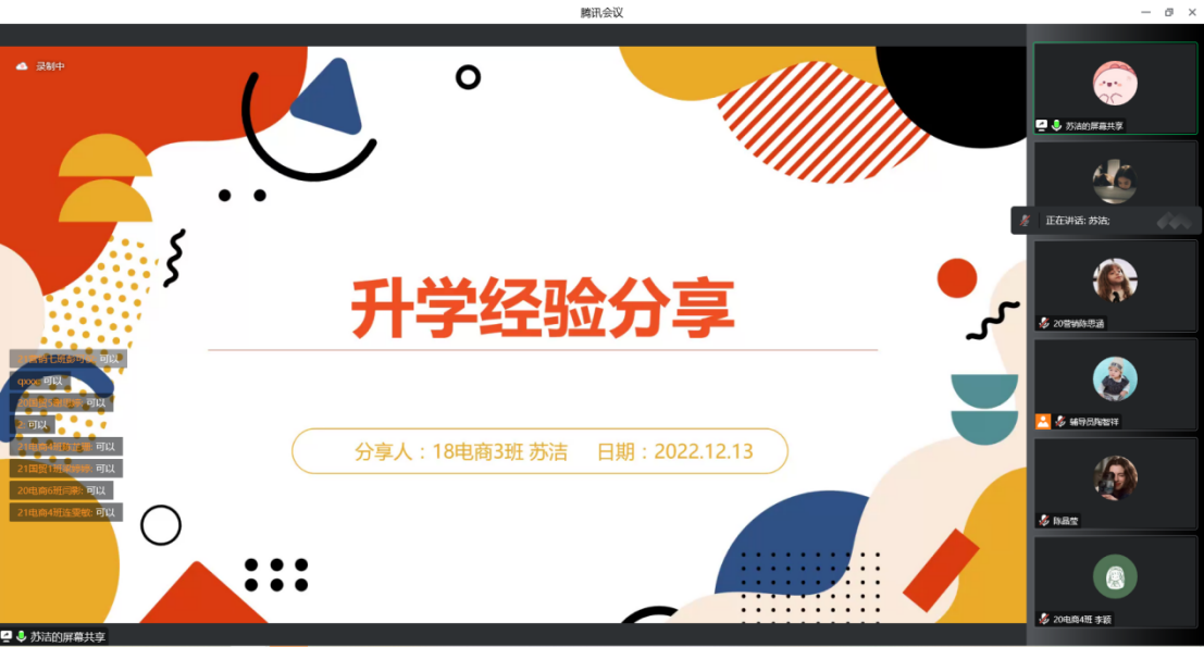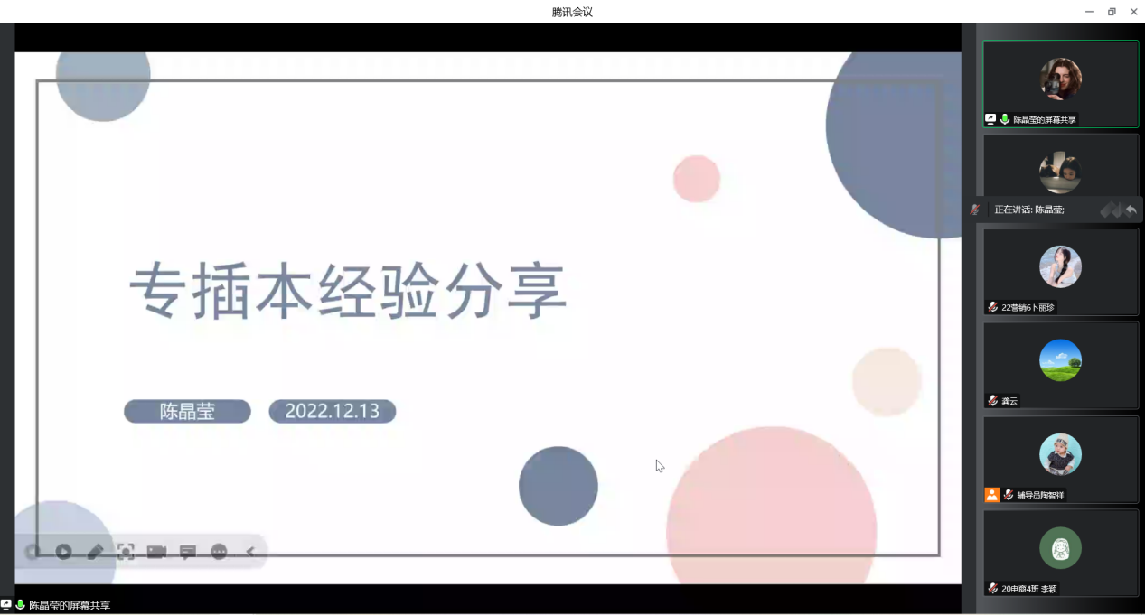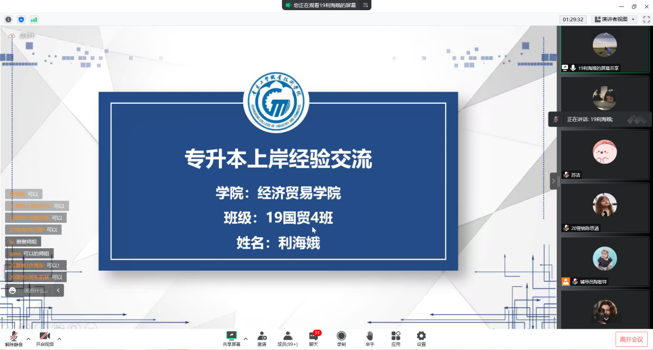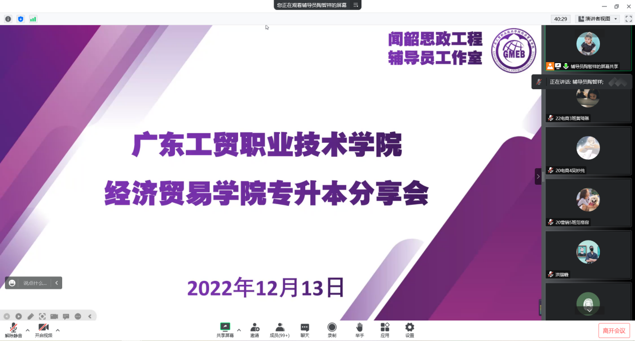 群鸿飞四海,爱心留故园;海阔凭鱼跃,天高任鸟飞。为深入学习贯彻党的二十大精神,切实做好2023届毕业生普通专升本工作,帮助毕业生更好的备考,12月13日下午,经济贸易学院通过腾讯会议线上组织召开了2023届毕业生普通专升本备考经验分享会。会议邀请了成功专升本的往届优秀毕业生18电商1班陈晶莹、18电商3班苏洁、19国贸4班利海娥为23届毕业生分享升本经验。学院党总支副书记龚云、分管毕业班的辅导员出席本次分享会,会议由经贸学院就业联络员陶智祥主持。