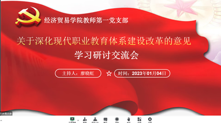 2023年1月4日晚上8点,经济贸易学院教师第一党支部在腾讯会议召开了深入学习《关于深化现代职业教育体系建设改革的意见》(以下简称《意见》)的专题会议,经贸学院教师第一党支部全体成员出席会议,参与学习研讨,会议由支部书记廖晓虹主持。