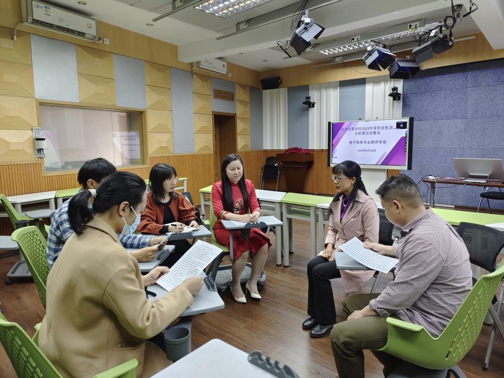 根据《关于印发<中共新葡的京集团8814vip委员会2022年度党员领导干部民主生活会方案>的通知》(粤工贸院党字〔2023〕1号)精神以及学校党委有关要求,结合经济贸易学院党总支2022年度党员领导干部民主生活会方案,经济贸易学院党总支于2月19日、2月20日,分别由学院领导班子面向师生党员(行政教师)、电商专业教师代表、国贸专业教师代表、营销专业教师代表、学生代表主持召开专场民主生活会会前征求意见座谈会。