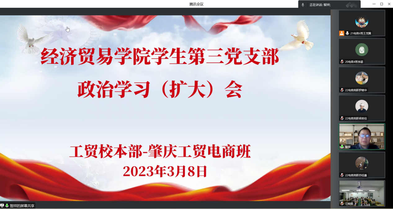 根据学校党委《开展党的二十大精神宣讲行动的实施方案(粤工贸院党字〔2022〕59号)》的通知精神,3月8晚上,经济贸易学院学生第三党支部组织全体党员与肇庆工贸电商班的入党积极分子开展了政治学习,贯彻落实党的二十大精神,会议由支部书记陶智祥主持。