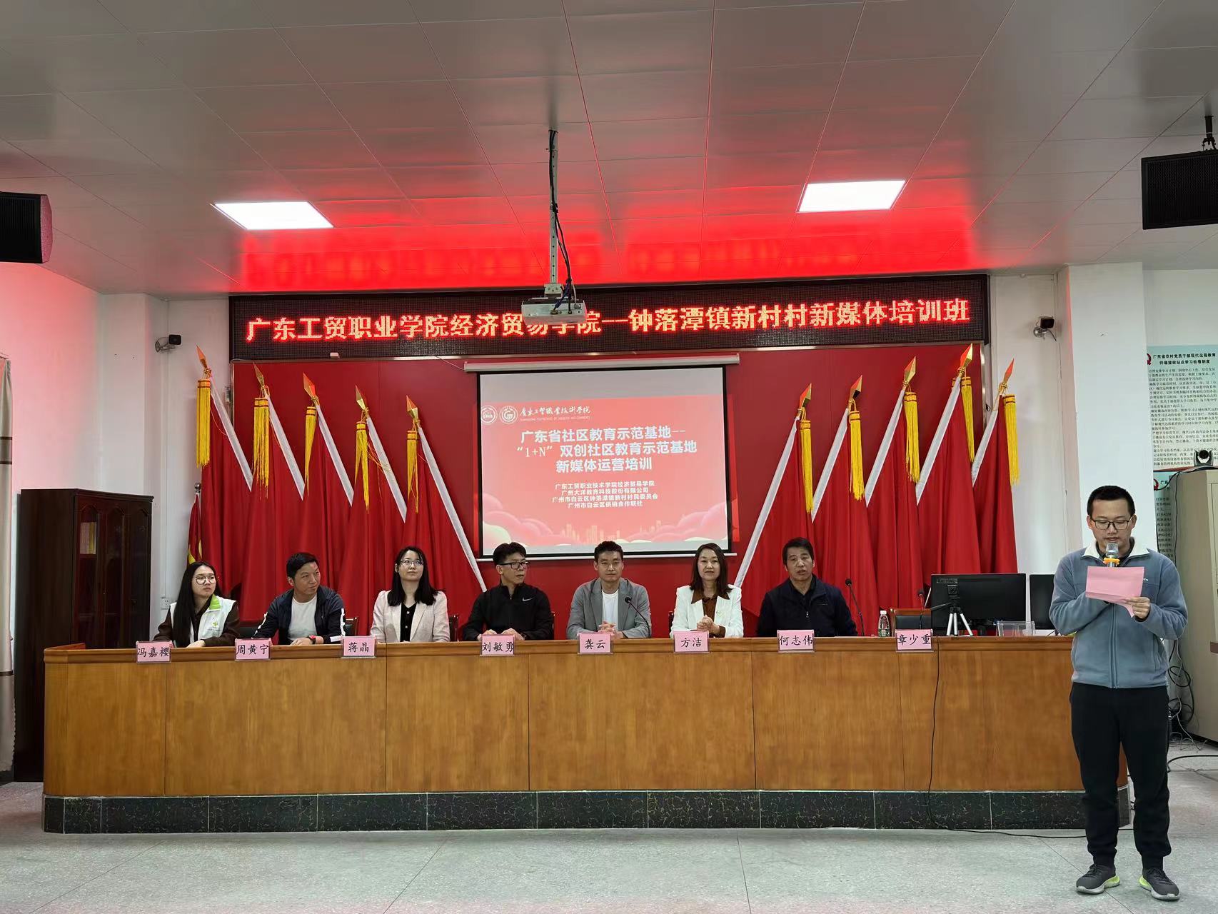 为深入学习贯彻习近平新时代中国特色社会主义思想,贯彻落实党的二十大精神,落实教育部《关于进一步推进社区教育发展的意见》和省教育厅《关于大力发展社区教育推进学习型社会建设的意见》,3月5日上午,由新葡的京集团8814vip经济贸易学院、钟落潭镇新村村委、广州市白云区供销合作联社、广州大洋教育科技股份有限公司四方合力打造的“1+N”双创社区教育示范基地新媒体运营培训班开班仪式在新村村委党员活动中心顺利举行。这也是广东省职业典型培训项目“全栈运营,逐梦再启航——新媒体运营培训”的新村村专场培训。经济贸易学院党总支副书记龚云、钟落潭镇新村村党总支副书记刘敏勇、经济贸易学院副院长蒋晶、广州大洋教育科技股份有限公司总经理周黄宁、广州市白云区供销合作联社社工冯嘉樱,以及培训班导师、学员50余人出席了开班仪式。