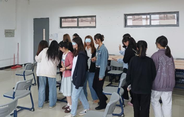 在“盲人与拐杖”游戏中,同学们两两一组,分别扮演盲人与拐杖。“盲人”在“拐杖”的帮助下躲避障碍物走到终点。同学们在角色扮演的过程中通过助人自助,增强了对他人的理解和信任。游戏结束后,扮演盲人的同学表示在“拐杖”的帮助下很安心,而扮演拐杖的同学也表示感受到了来自“盲人”的信任。