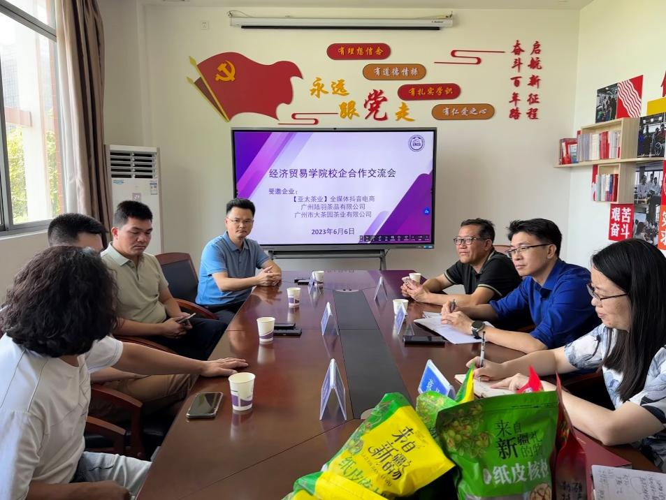 为学习贯彻习近平新时代中国特色社会主义思想,进一步深入推进产教融合、校企合作,6月6日上午,经贸学院与亚太茶业全媒体抖音电商、广州陆羽茶品有限公司、广州市大茶园茶业有限公司等企业代表在明德楼1-217会议室召开校企合作交流座谈会。经贸学院党总支书记李繁,经贸学院副院长、教师第二党支部书记蒋晶,经贸学院离岗创业教师、教师第二党支部党员李政敏副教授出席会议,会议由李繁主持。