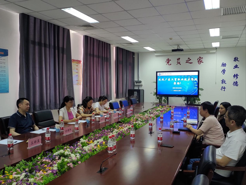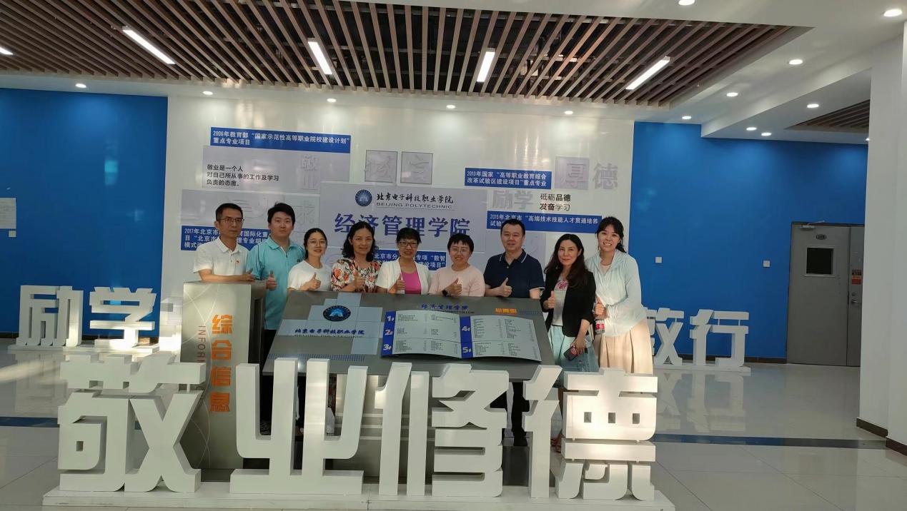 为扎实推进学习贯彻习近平新时代中国特色社会主义思想主题教育,把理论学习与调查研究有机融合,推动专业发展、提升教学科研水平,6月9日-10日,经贸学院院长邱秀芳带领省级示范性产业学院“广东工贸-京东数字经济产业学院”“消费升级与数字化营销”项目负责人甘朝阳,以及团队成员,赴北京电子科技职业学院学习交流,受到北京电子科技职业学院经济管理学院院长戚瑞双、院系骨干教师王萍、马骏、崔笑宇的热情接待。