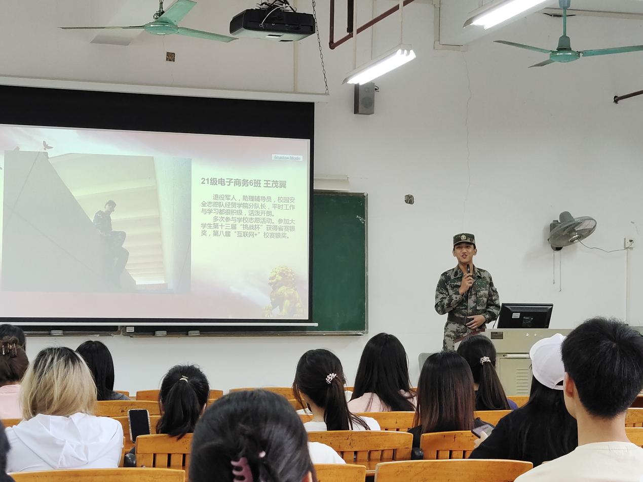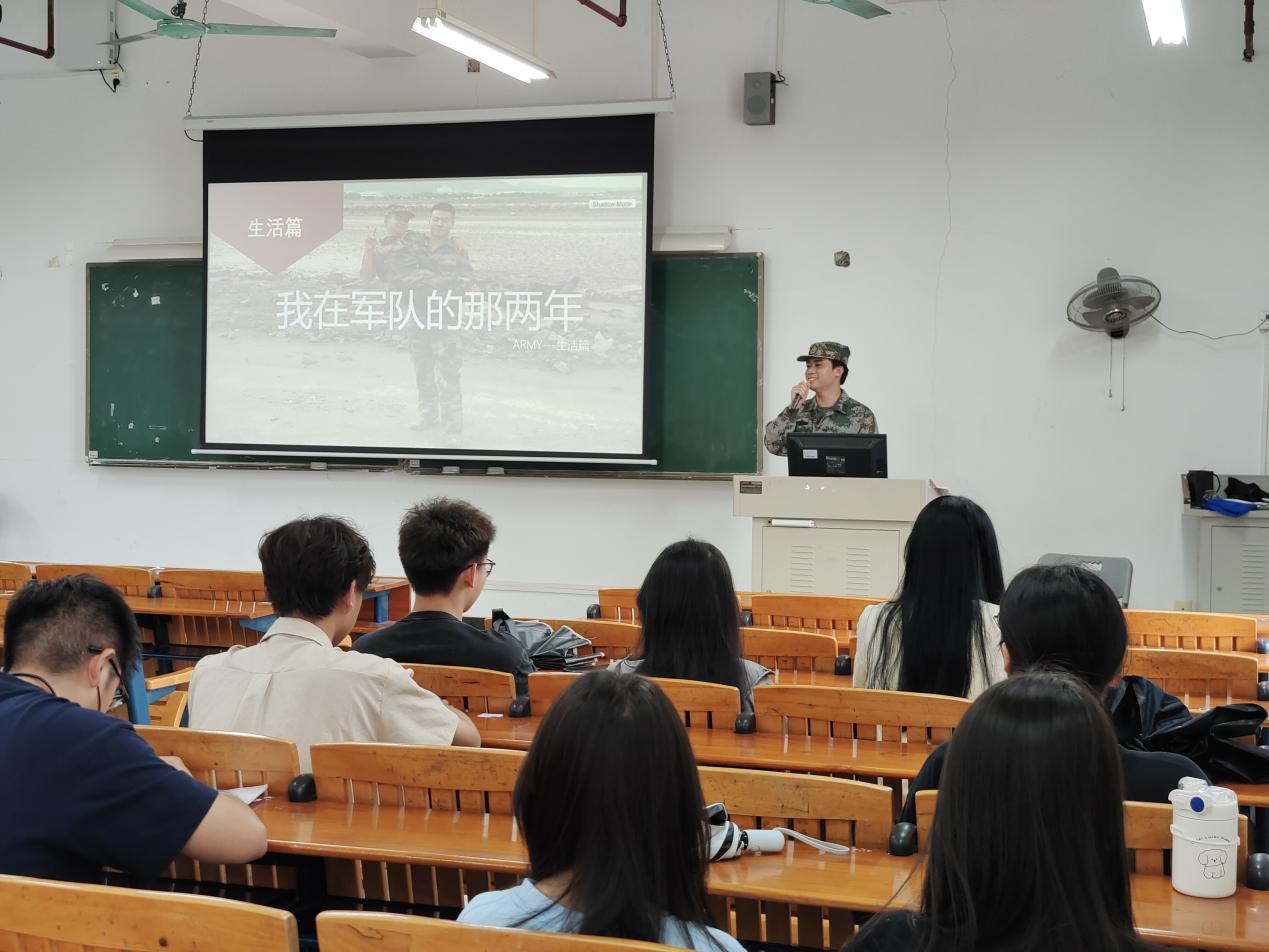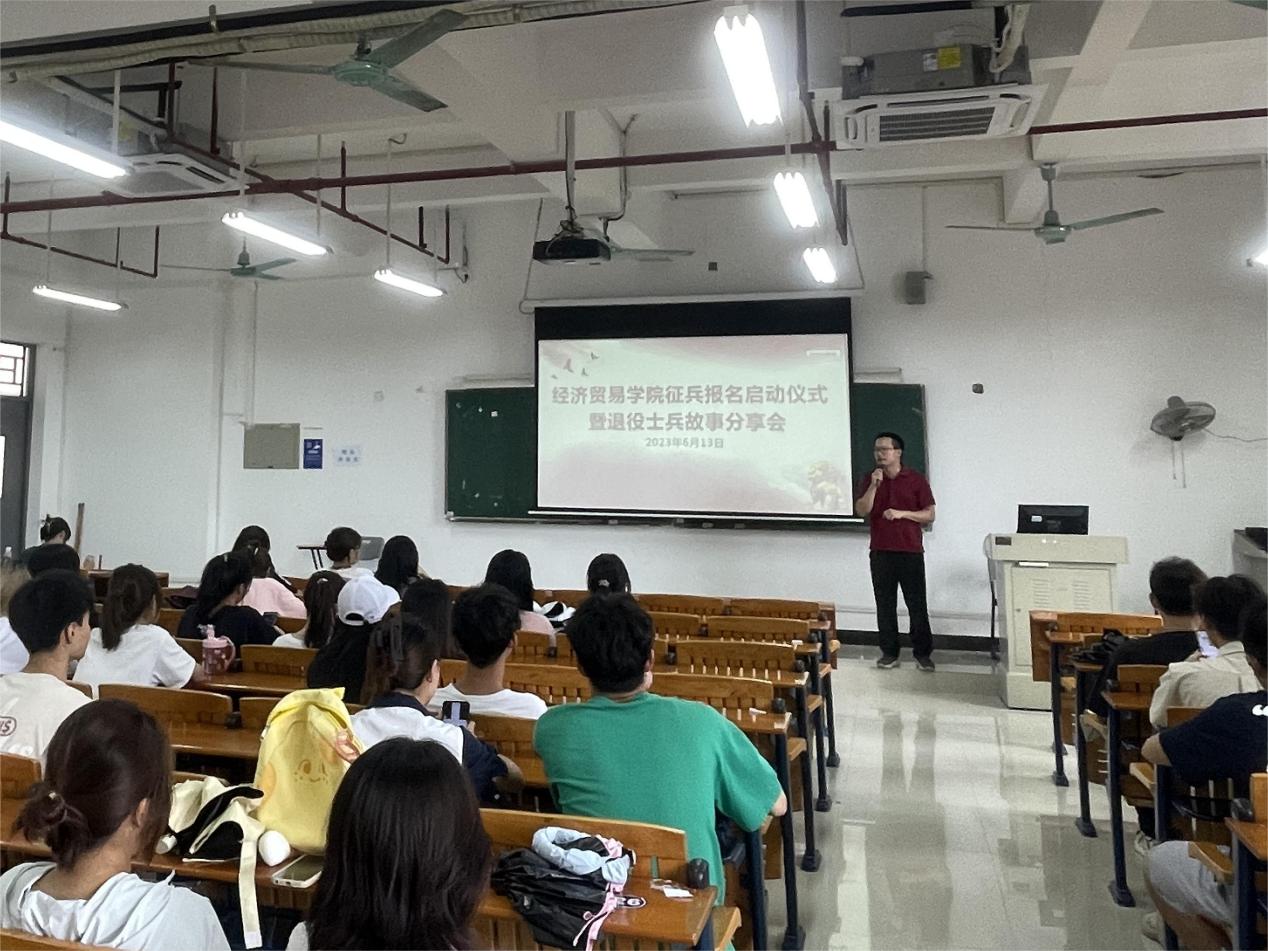 人的一生会推开很多扇门,每扇门后都可能会有意想不到的风景。从千米高空俯瞰大地,驰骋大洋深潜海底,坚守高原保卫祖国。和平年代,在抗疫抗灾前线,总有那么一群人身着迷彩绿,勇敢逆行。为深入学习贯彻习近平新时代中国特色社会主义思想,按照学院主题教育部署安排,进一步做好2023年秋季大学生征兵工作,6月13日下午,经济贸易学院召开征兵宣传与退役士兵故事分享会,进一步增强学生国防观念,鼓励适龄青年响应国家号召参军入伍。会议由辅导员章少重主持,退伍大学生代表和各班级代表参加了本次分享会。