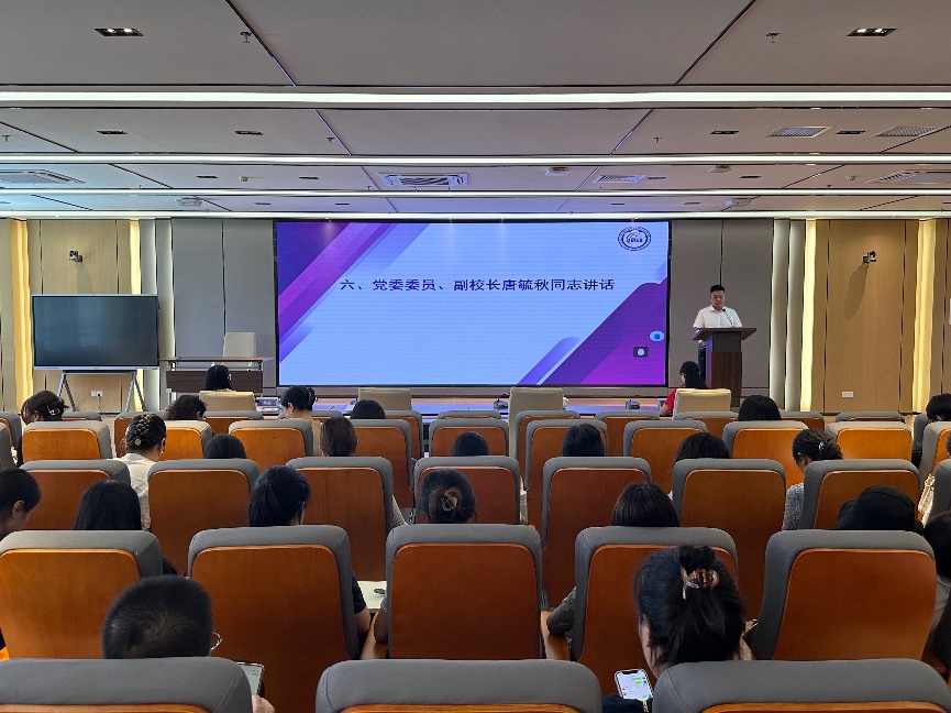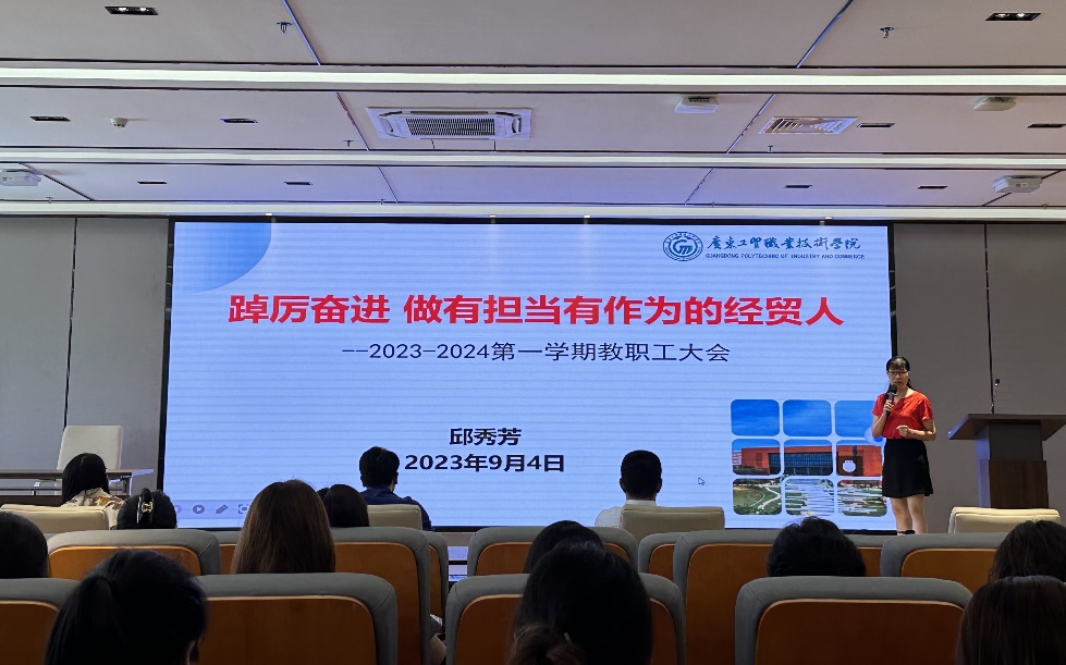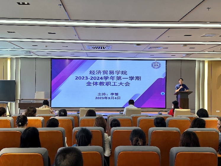 金秋送爽团结奋进结硕果,天高云淡抖擞精神启新航。为认真学习贯彻习近平新时代中国特色社会主义思想,进一步明晰新学期规划,开新局、谋新篇,确保各项工作有序开展,2023年9月4日上午,经济贸易学院2023-2024学年第一学期全体教职工大会在白云校区图书信息楼629会议室召开,党委委员、副校长唐毓秋及经贸学院全体教职工出席会议。会议由经贸学院党总支书记李繁主持。