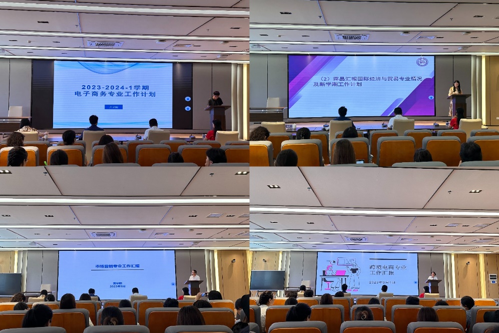 会上,方文超、蒋晶、黄华乾及陈建兰等4位专业带头人(负责人)分别汇报了电子商务、国际经济与贸易、市场营销及跨境电子商务等专业情况及新学期工作计划。