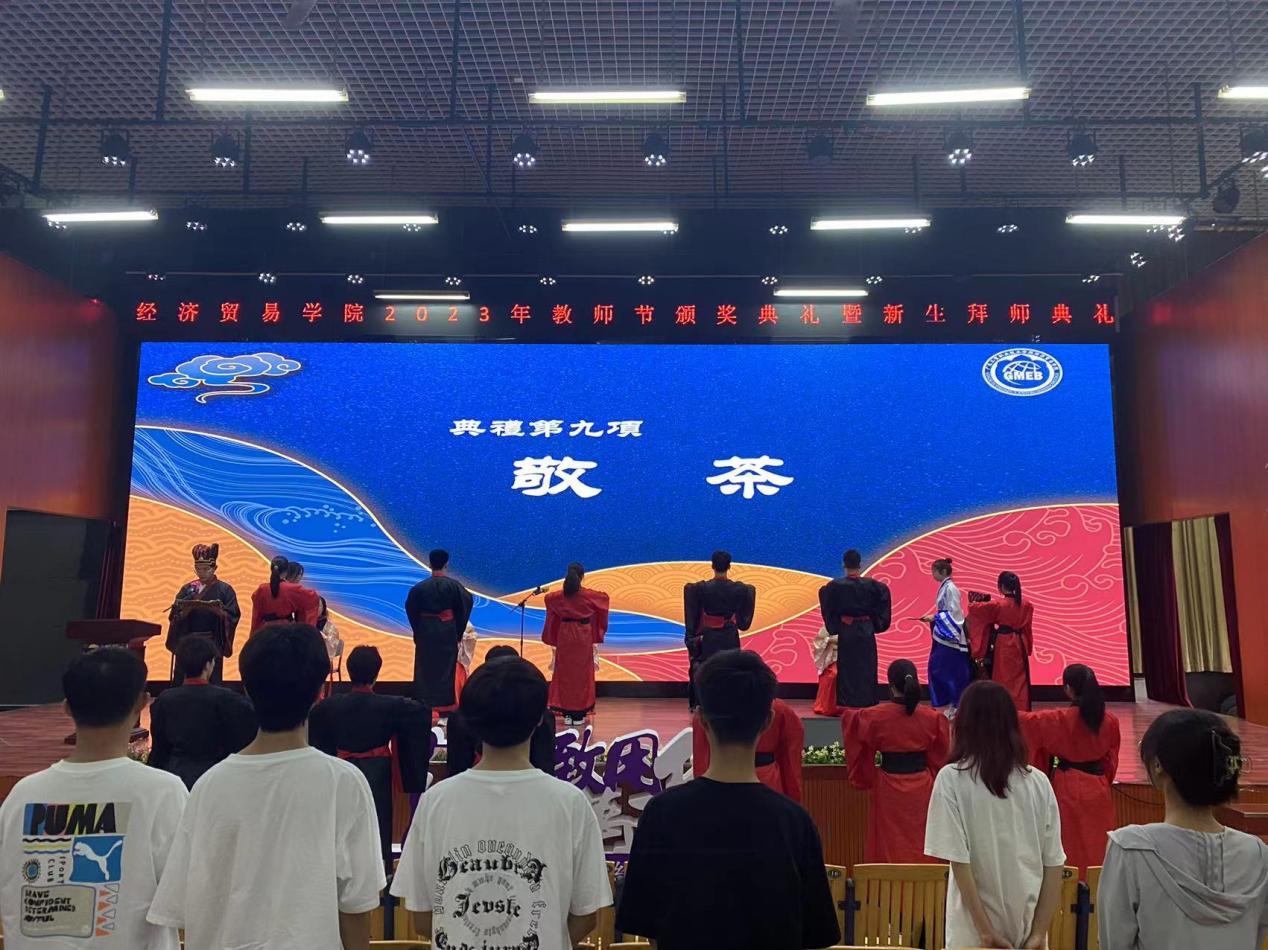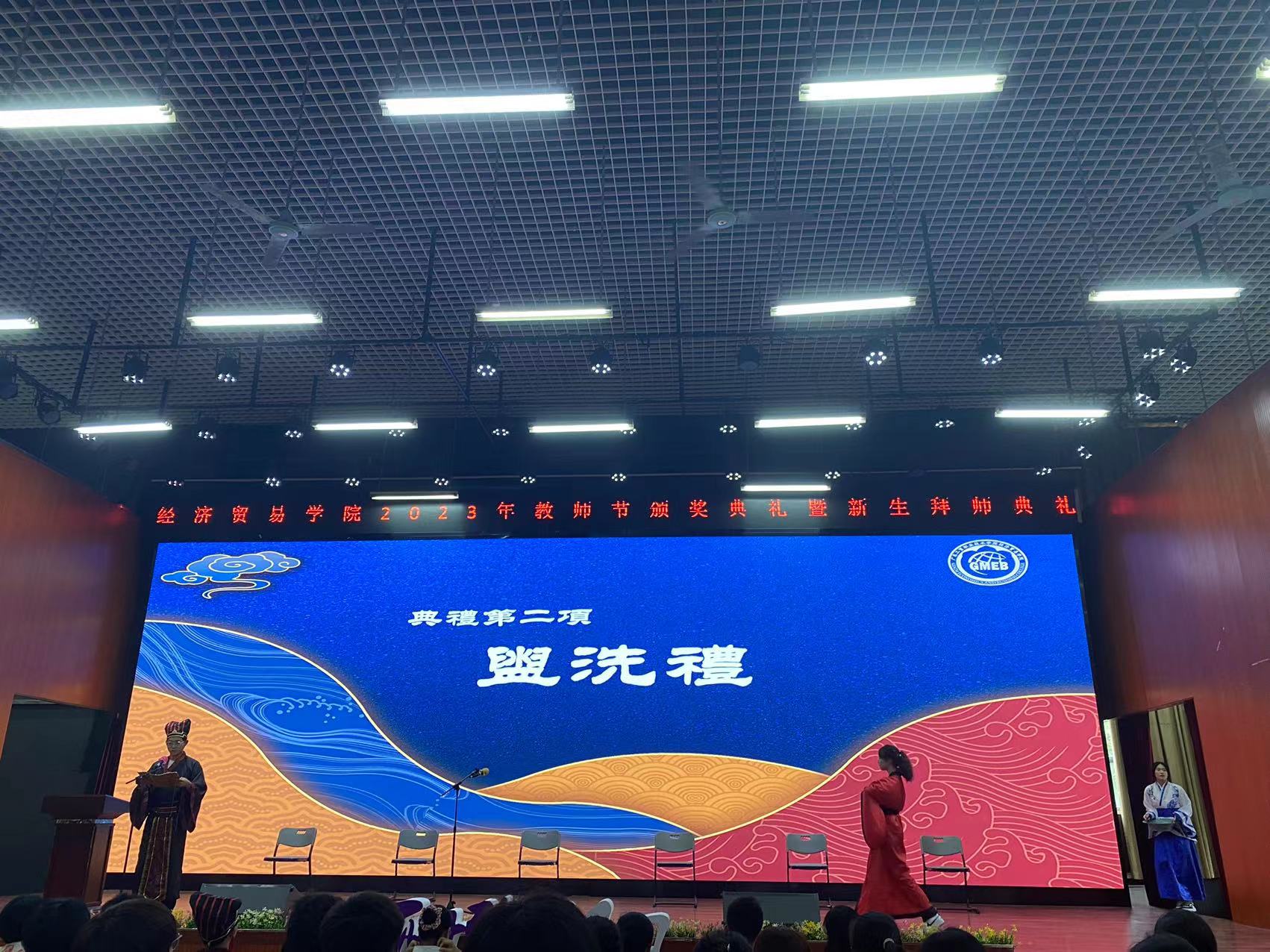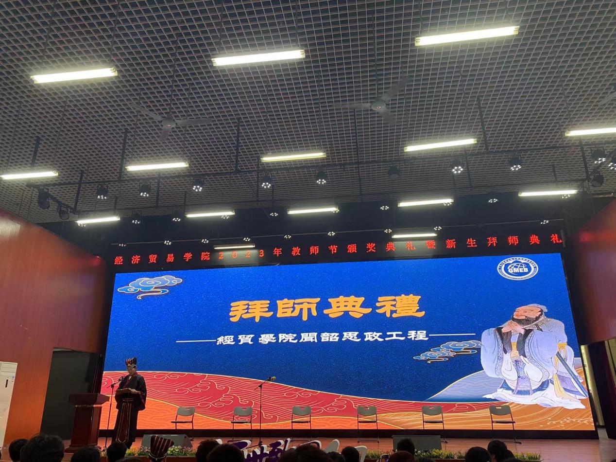 植根沃土,方能芬芳。中华优秀传统文化中的尊师重教,是中华民族的传统美德,也是践行立德树人根本任务的重要保证。为深入学习贯彻习近平新时代中国特色社会主义思想,深入挖掘中华优秀传统文化蕴含的思想观念、人文精神及道德规范,经济贸易学院于9月14日在白云校区105演艺厅举行了一场盛大的2023级新生拜师典礼。本次典礼采用线上、线下相结合的方式,通过实时直播让未能现场参加的师生一同感受典礼的氛围。经贸学院党总支书记李繁,院长邱秀芳及全体教师、2023级新生代表出席本次典礼。
