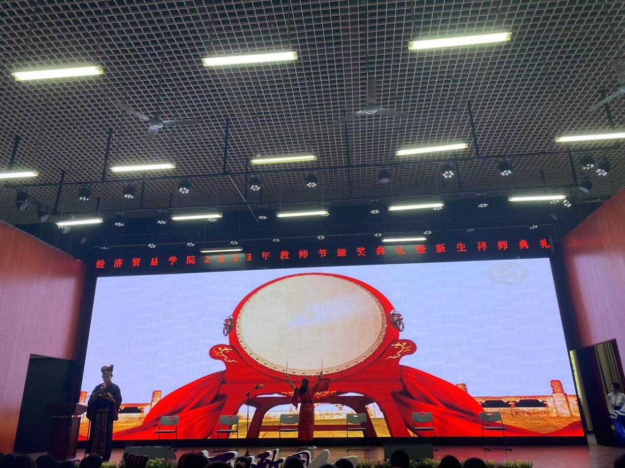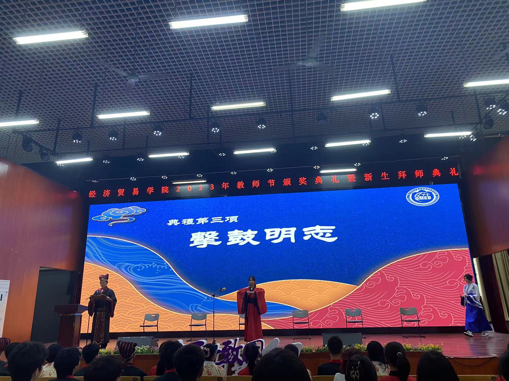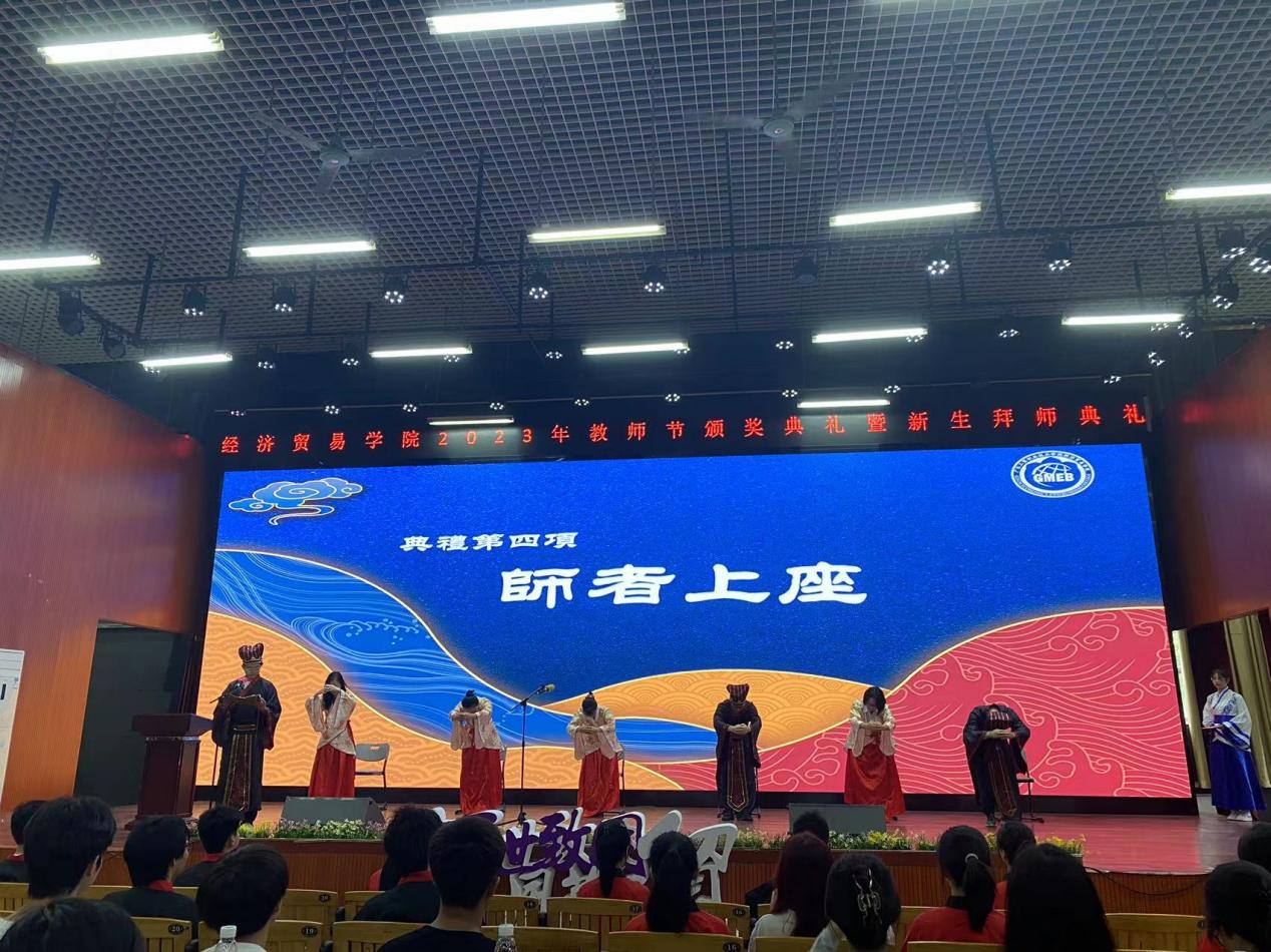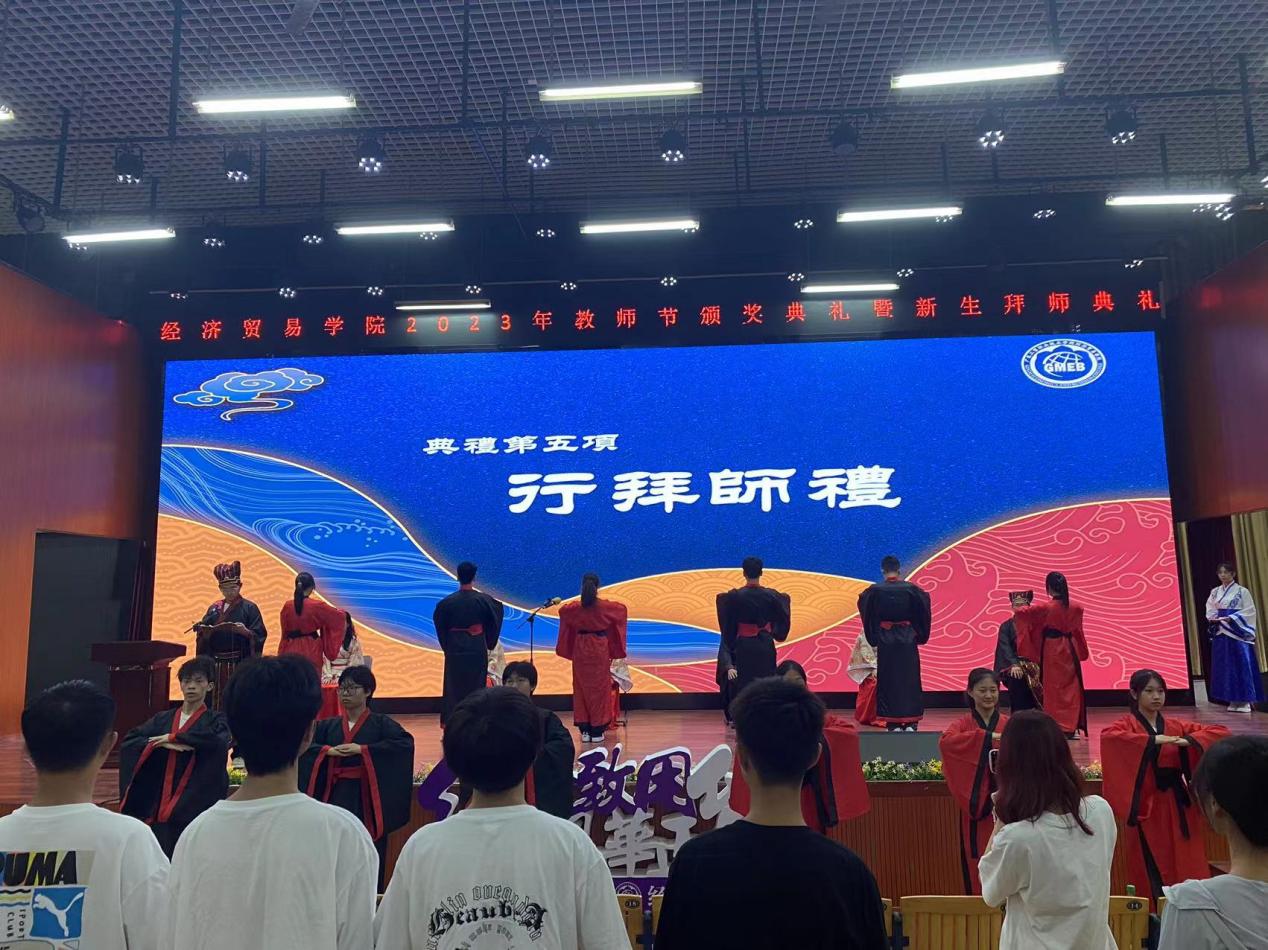 植根沃土,方能芬芳。中华优秀传统文化中的尊师重教,是中华民族的传统美德,也是践行立德树人根本任务的重要保证。为深入学习贯彻习近平新时代中国特色社会主义思想,深入挖掘中华优秀传统文化蕴含的思想观念、人文精神及道德规范,经济贸易学院于9月14日在白云校区105演艺厅举行了一场盛大的2023级新生拜师典礼。本次典礼采用线上、线下相结合的方式,通过实时直播让未能现场参加的师生一同感受典礼的氛围。经贸学院党总支书记李繁,院长邱秀芳及全体教师、2023级新生代表出席本次典礼。