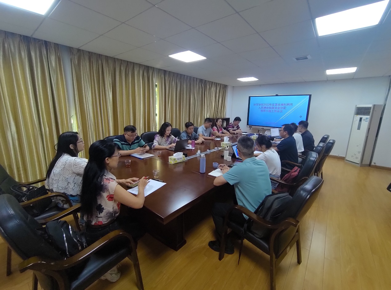 经贸学院根据学校文件要求,秉着公平、公正、公开的原则,于2023年9月23日及26日,通过线上线下的形式,分别召开2022年绩效分配领导小组会议,领导小组由学院领导、两办主任、系正副主任、专业带头人、以及行政秘书、辅导员等代表共16人组成。会议由院长邱秀芳主持。
