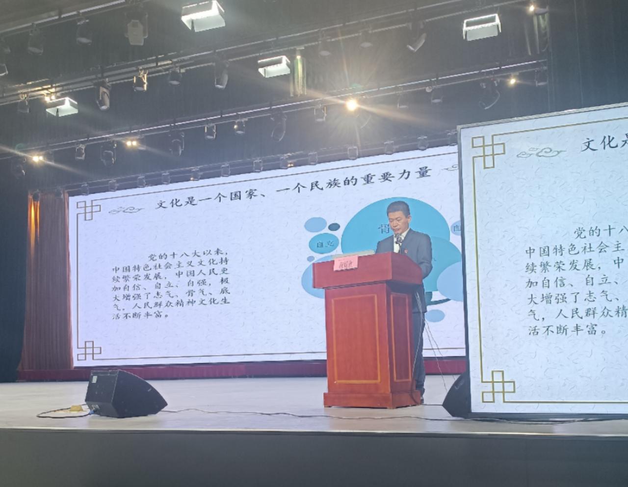 唐毓秋以《深入学习贯彻习近平文化思想 以文化人 以文育才 勇担新时代新的文化使命》为主题,用亲身经历、生动事例、幽默方式、热情洋溢的语言向听课的同学们讲述了文化强则国强,文化兴则国兴,人类社会的每一次跃进、人类社会的每一次升华,无不伴随着文化的历史性进步。他的认真严谨的态度给在场师生留下了深刻的印象。