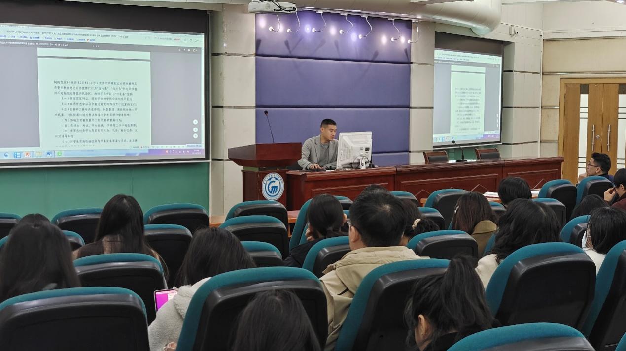 2月25日上午,经贸学院党总支副书记龚云于天河校区西区综合楼5楼报告厅为学院全体教师开讲“师德第一课”。与老师们一起认真细致地学习了《新葡的京集团8814vip教师师德规范(试行)》《新葡的京集团8814vip教师师德失范行为负面清单及处理办法》及《新葡的京集团8814vip师德师风承诺书》等内容。