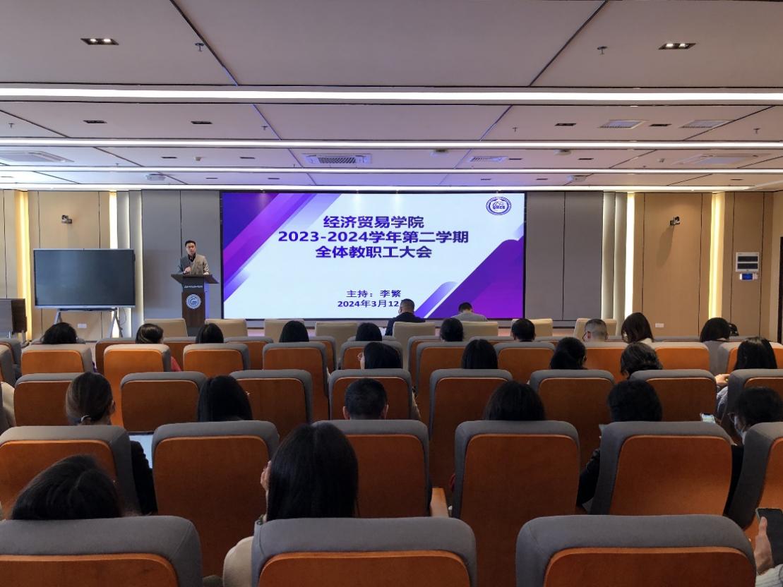 为深入学习和领会全国两会精神,准确把握2024年全国教育工作会议精神和教育部教育工作重点任务及广东省教育工作会议精神和工委、教育厅2024年工作要点,深入领会学校高质量发展大会精神,以积极主动、不等不靠的优良作风,以超强的专业素养和能力为学校和经贸学院的高质量发展贡献力量,3月12日下午,经贸学院于白云校区图书信息楼629室召开新学期第二次全体教职工大会。学校党委委员、副校长唐毓秋及经贸学院全体教职工出席会议。会议由经贸学院党总支书记李繁主持。
