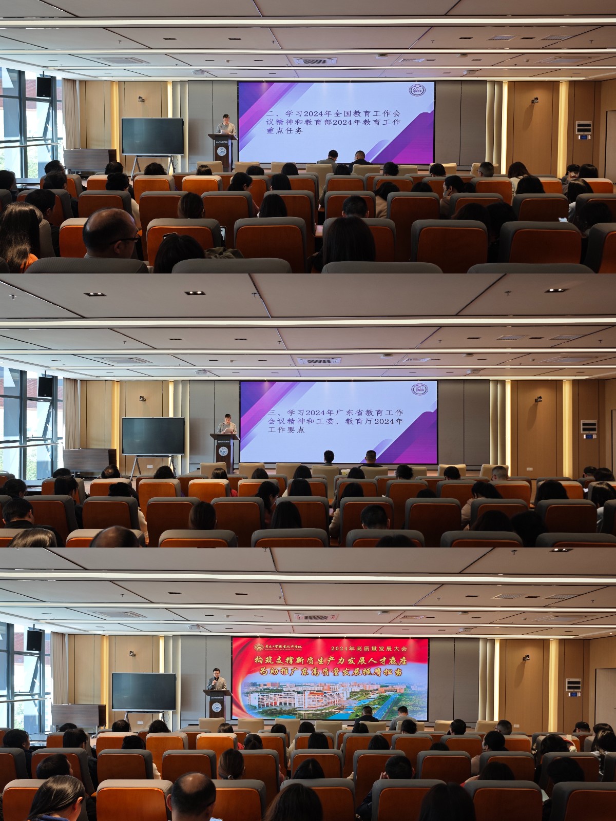 会议集中传达学习2024年全国教育工作会议精神和教育部2024年教育工作重点任务,2024年广东省教育工作会议精神和工委、教育厅2024年工作要点和学校高质量发展大会精神。