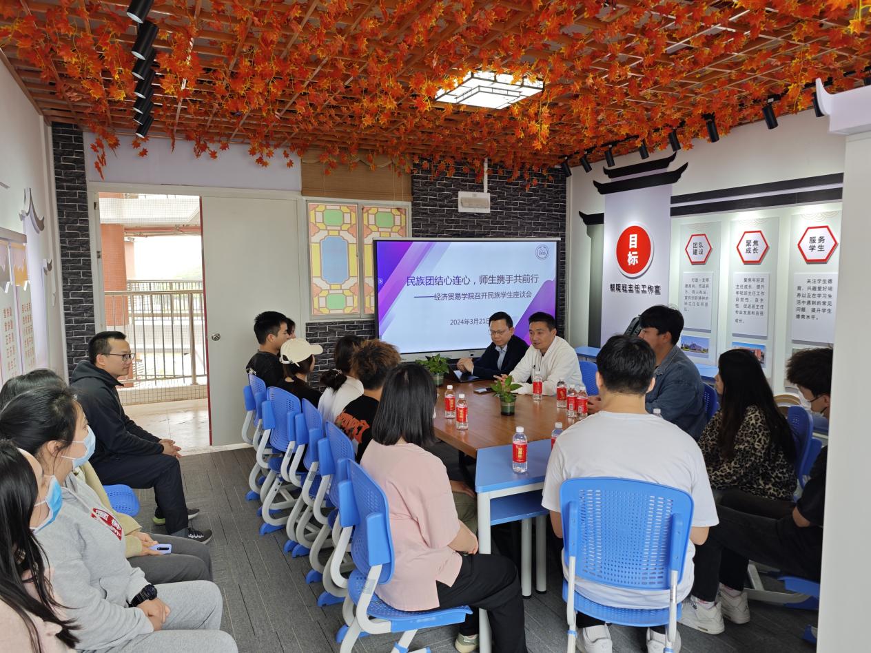 为推进一站式学生社区建设,促进各民族学生交流,深化民族团结教育,铸牢中华民族共同体意识,2024年3月21日下午,经济贸易学院在白云校区朝阳班主任工作室召开了“民族团结心连心,师生携手共前行”为主题的民族学生座谈会。会议由学院党总支副书记龚云主持,援疆博士、学院跨境电商专业带头人伍炜勤,辅导员章少重、吴海英、程旭蕊、莫雯嘉及部分民族学生代表参加会议。