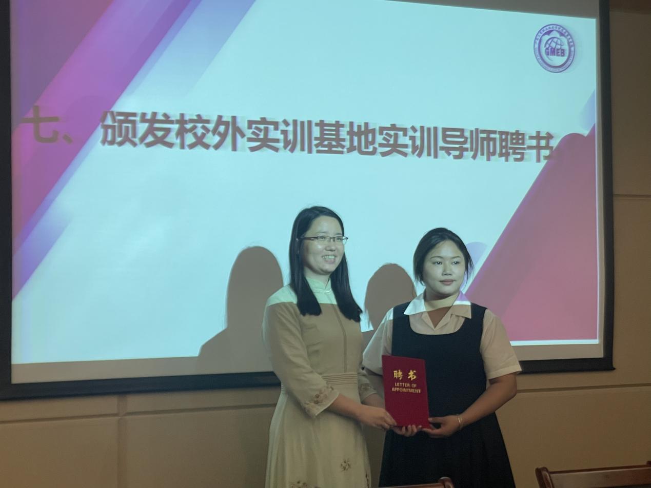 签约仪式后举办了开班仪式,首届鲸鱼精英特训班经过严格的笔试和实操选拔之后,最终有15位同学成为第一期鲸鱼精英特训班学员,他们将在市场营销专业教师和鲸鱼出海校外实训导师的带领下进行为期三个月的实操训练。李繁和蒋晶为李慧慧等五位校外实训基地实训导师颁发了聘书。