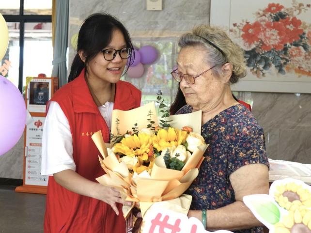 为老人献花