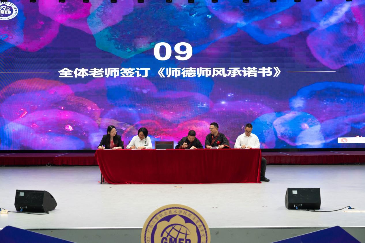 全体老师在蒋晶及各系(副)主任、专业带头人的带领下签订了《师德师风承诺书》,表达了对教育事业的坚定信念和对师德师风的坚守。《师德师风承诺书》的签订,代表了经贸学院全体教师的真心、决心和信心。他们将以更加饱满的热情和更加坚定的信念投身到教育事业中,为培养更多优秀人才而不懈努力。牢固树立良好师德师风,是经贸学院一贯的优良传统。新时代新征程,经贸学院将继续引导广大教师坚定理想信念,陶冶道德情操、涵养扎实学识、勤修仁爱之心,做“四有”好老师。