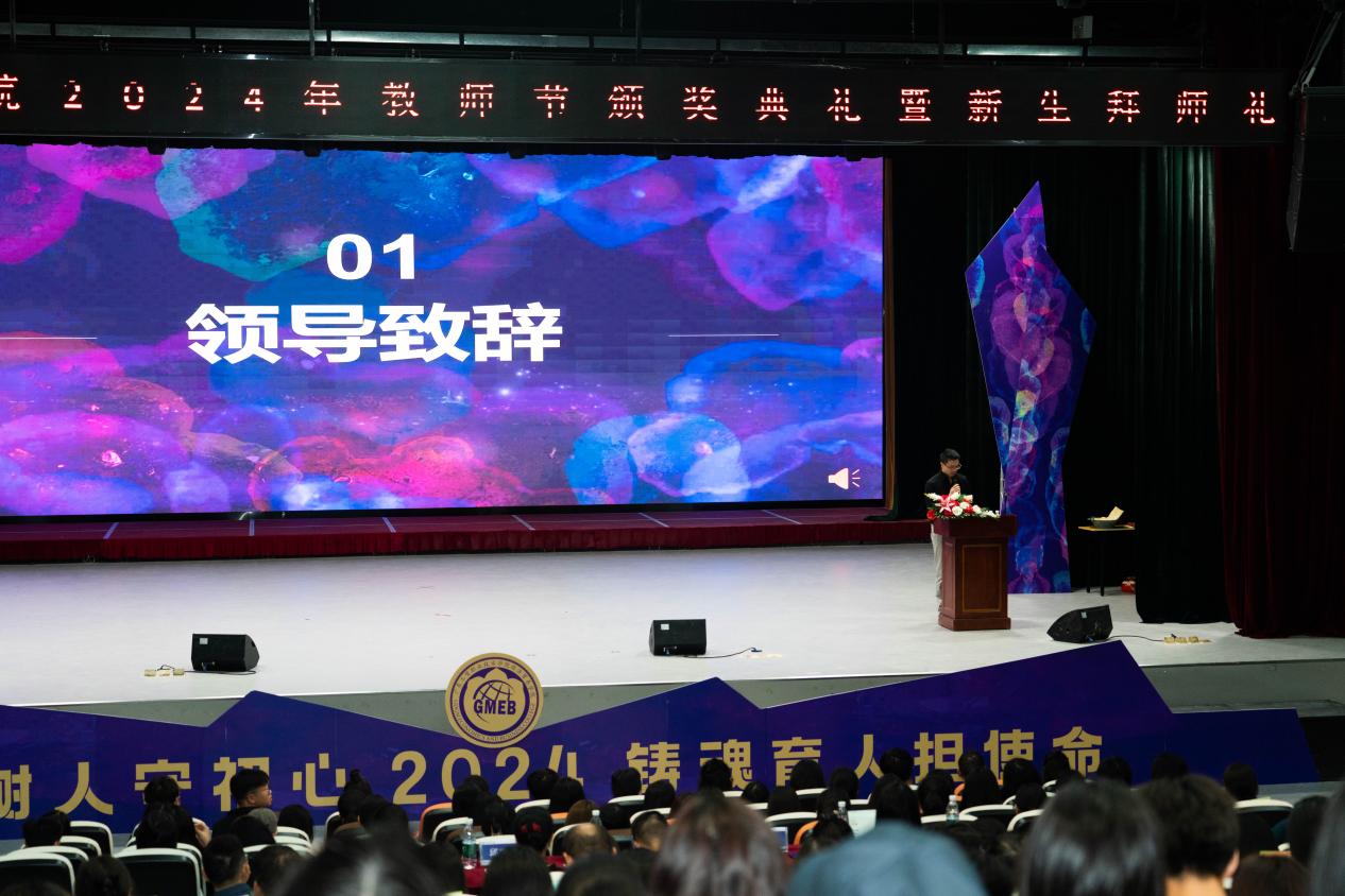 一支粉笔,两袖微尘,三尺讲台,四季耕耘。在这充满诗意与温情的秋色中,我们迎来了全国第40个教师节。为深入学习贯彻党的二十大精神,全面贯彻党的教育方针,聚焦师德建设主题教育月“大力弘扬教育家精神,加快建设教育强国”主题,经济贸易学院于9月24日下午2:10在白云校区学生活动中心演艺厅隆重举行2024年教师节颁奖典礼暨新生拜师典礼。会场内灯光璀璨、座无虚席,学院师生齐聚一堂,共同见证了这一庄重而充满意义的典礼。此次典礼旨在表彰在教育事业中做出突出贡献的教师、为新入职的教师举办“传帮带”仪式,并为新生举行庄严的拜师仪式。经贸学院党总支书记李繁、党总支副书记龚云、副院长蒋晶以及全体教职员工及新生代表近500人参加了本次典礼。