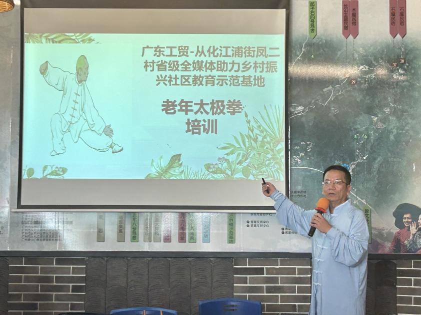 为丰富乡村老年人的精神文化生活,展现新时代老年人的精神风采,让社区老年人度过一个运动与健身并存的别样重阳节,进一步丰富社区老年人的文化体育生活,营造崇尚健身、参与健身、健康文明的社区氛围,10月11日至12日,在重阳节来临之际,“广东工贸—从化江埔街凤二村全媒体助力乡村振兴社区教育示范基地”项目团队于从化江埔街凤二村,开展了一场别开生面的“太极庆重阳,夕阳展风采——老年人太极拳培训”活动。此次活动涵盖老年人健康讲座、太极拳介绍与太极拳实操学习。活动由经贸学院副院长蒋晶主持,卢岩老师讲授,参与人员主要有经贸学院教师黄诗媛、张莉、陈秋娜、李彩丽等教师、学生第二党支部学生党员、积极分子代表、凤二村村委、村民老年朋友等。