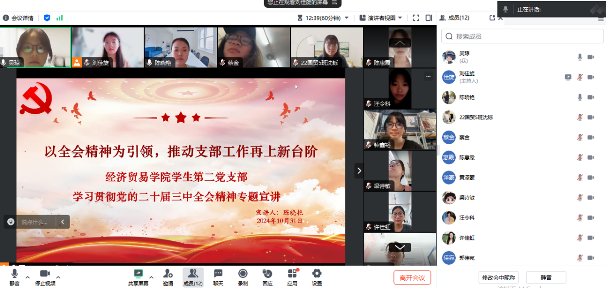 10月31日,经济贸易学院学生第二党支部书记陈晓艳以“以全会精神为灯塔,引领支部工作迈向新高度”为主题,通过线上平台再次为全体党员带来了一场思想深刻、启迪人心的专题宣讲。陈晓艳指出,全会明确将教育、科技、人才定位为中国式现代化的基石与战略支撑,这为职业教育带来了前所未有的发展机遇,同时也提出了新的要求与挑战。她呼吁全体党员要将全会精神内化于心、外化于行,将其转化为推动支部工作高质量发展的实际行动,并结合个人成长规划,积极投身于全面深化改革的伟大实践,为中国式现代化建设添砖加瓦。