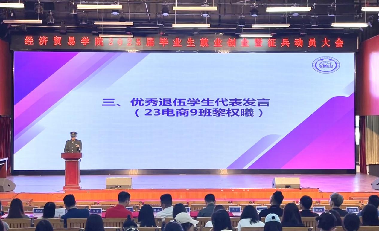 毕业生代表 22 级市场营销5班张倩分享了就业的思考与期待,呼吁大家早规划早行动。退伍学生代表23级电子商务9班黎权曦讲述了军旅生涯收获,号召大家踊跃应征入伍,为实现强国梦、强军梦贡献青春力量。