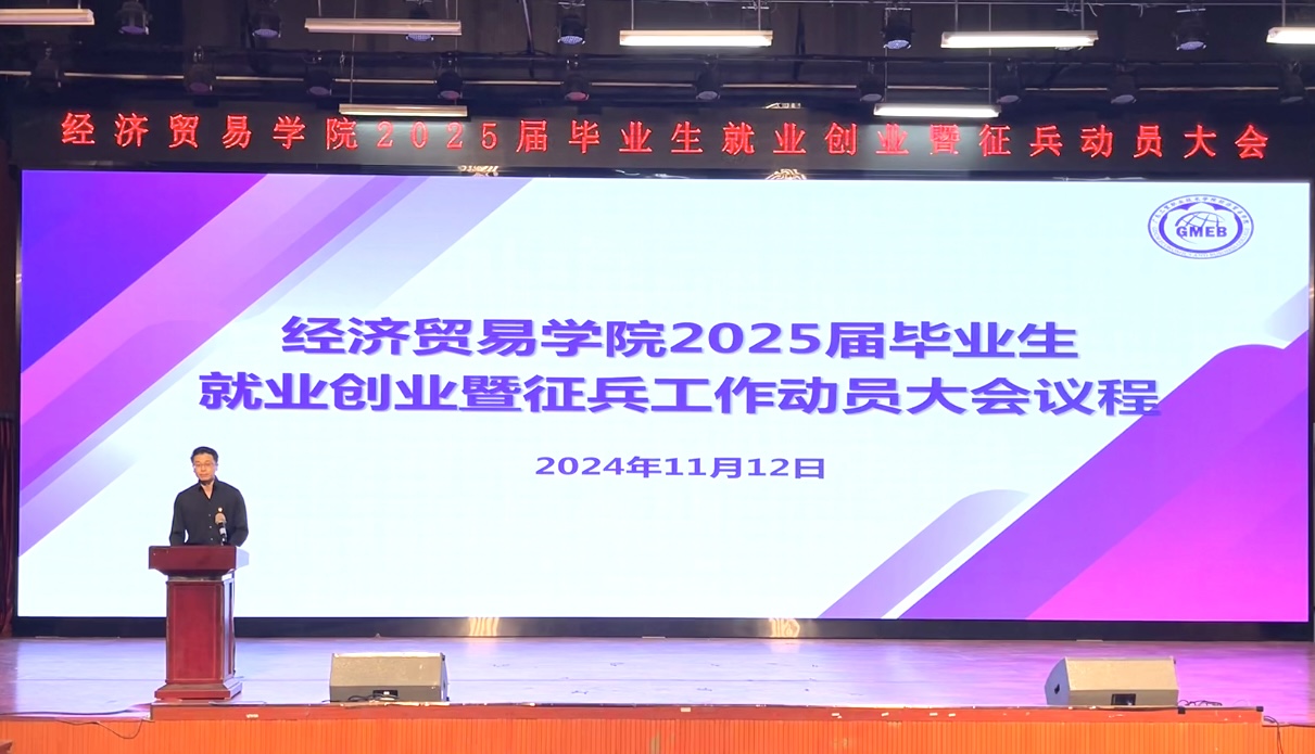 为全面落实教育部、省教育厅和学校有关就业工作要求,推进2025届毕业生就业征兵工作,2024年11月12日下午,经济贸易学院在白云校区明德楼2-105举行2025届毕业生就业创业暨征兵工作动员大会。学校党委委员、副校长唐毓秋,经济贸易学院党总支书记李繁,院长蒋晶,党总支副书记龚云,招生就业科科长管宸坤、助学中心主任林嘉,广州凤和城运营管理有限公司、芋头文化传媒(东莞市)有限公司及广州新动力医药科技有限公司的企业代表,全体毕业班辅导员、班主任及2025届毕业生参加了本次大会。会议由李繁主持。