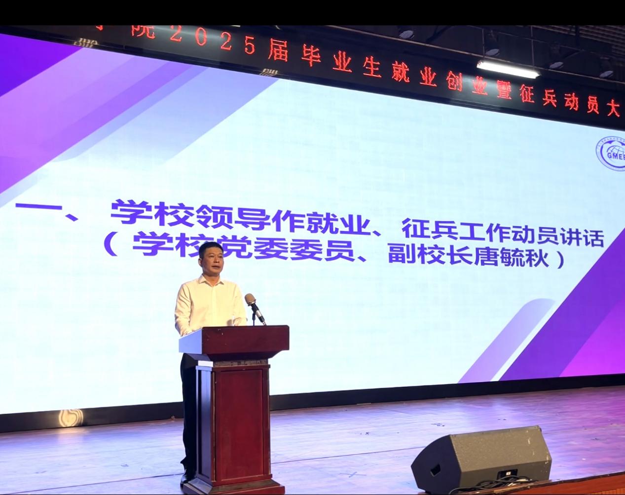 唐毓秋作动员讲话,要求全院师生要进一步统一思想,切实增强做好就业和征兵工作的使命感。为做好就业工作,他强调,一是要提高政治站位,强化责任,全员参与就业;二是要创新方式,多措并举,做实做细就业指导帮扶;三是要压实工作责任,深入开展“访企拓岗”行动;四是要同学们明确目标,转变观念,提升能力,积极推进全员就业。