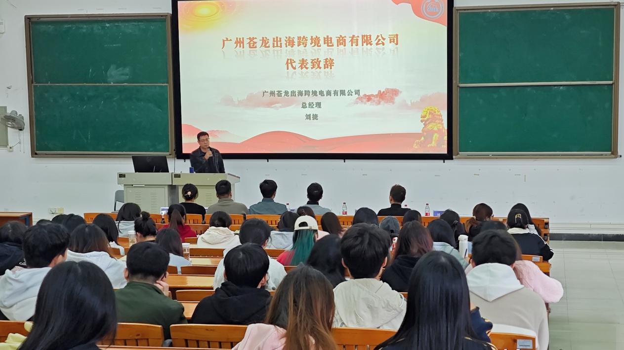 开幕式上,刘捷代表企业上台发言,他对跨境电商专业的同学们表达了亲切的问候,并介绍了广州苍龙出海跨境电商有限公司,同时,从跨境电商的发展趋势、行业现状、市场机遇等多个角度,为同学们进行了深入浅出的讲解跨境电商发展前景以及从事跨境电商职业岗位的需求。同学们听得津津有味,不时发出阵阵掌声。