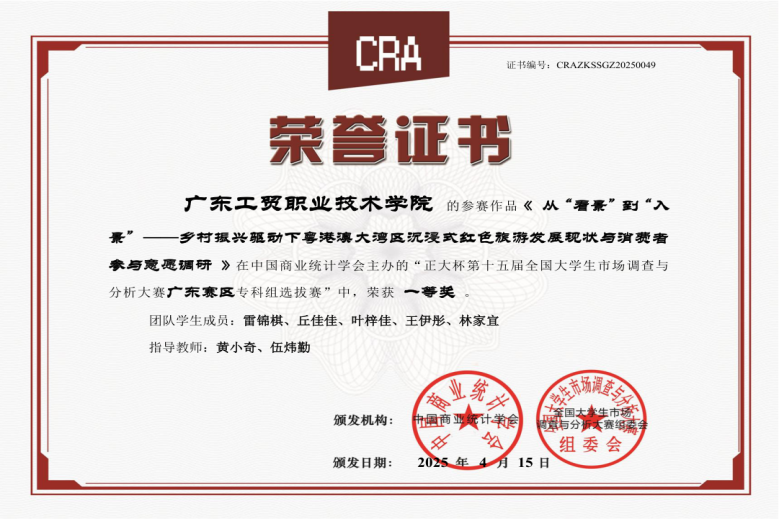 近日,第十五届全国大学生市场调查与分析大赛传来捷报:新葡的京集团8814vip经济贸易学院雷锦棋等5名同学在黄小奇、伍炜勤、吴浩老师指导下,凭借《乡村振兴驱动下粤港澳大湾区沉浸式红色旅游发展现状与消费者参与意愿调研》项目,从全国数千支队伍中突围,斩获国赛三等奖,此前已摘得广东赛区一等奖。