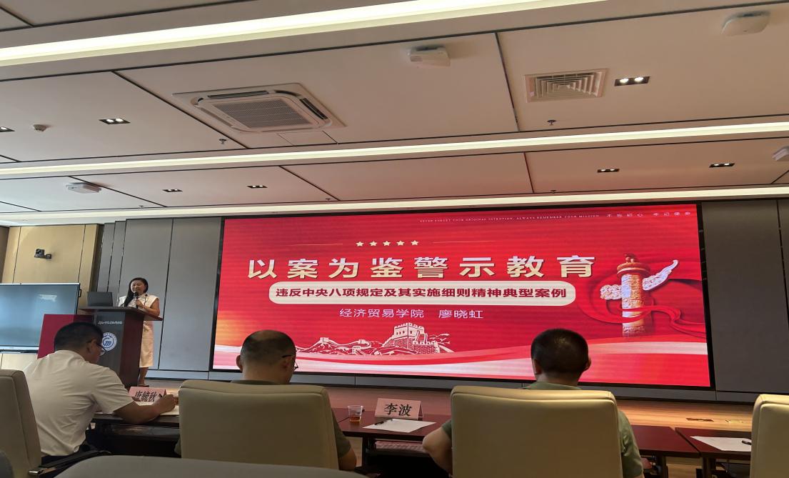 为推动深入贯彻落实中央八项规定及其实施细则精神学习教育走深走实,2025年9月2日下午,经济贸易学院教师第一党支部在博学楼629会议室开展“以案为鉴”中央八项规定精神专题警示教育。会议由经济贸易学院教师第一党支部书记廖晓虹主持。
