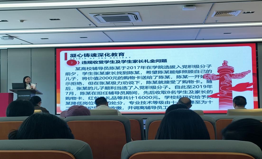 随后,廖晓虹继续领学“违反中央八项规定及其实施细则精神典型案例”。学习聚焦中央八项规定实施细则中的党风廉政建设要求,通过分享典型案例开展警示教育,如违规收送名贵特产和礼品礼金、违规收受学生及学生家长礼金、违规吃喝等问题,强调党员教师要筑牢思想防线、严守纪律底线,在教育教学、科研经费等关键环节杜绝“四风”问题。党员教师纷纷表态,将把纪律要求内化于心、外化于行,在各自岗位上坚守廉洁底线,维护教师队伍良好形象。