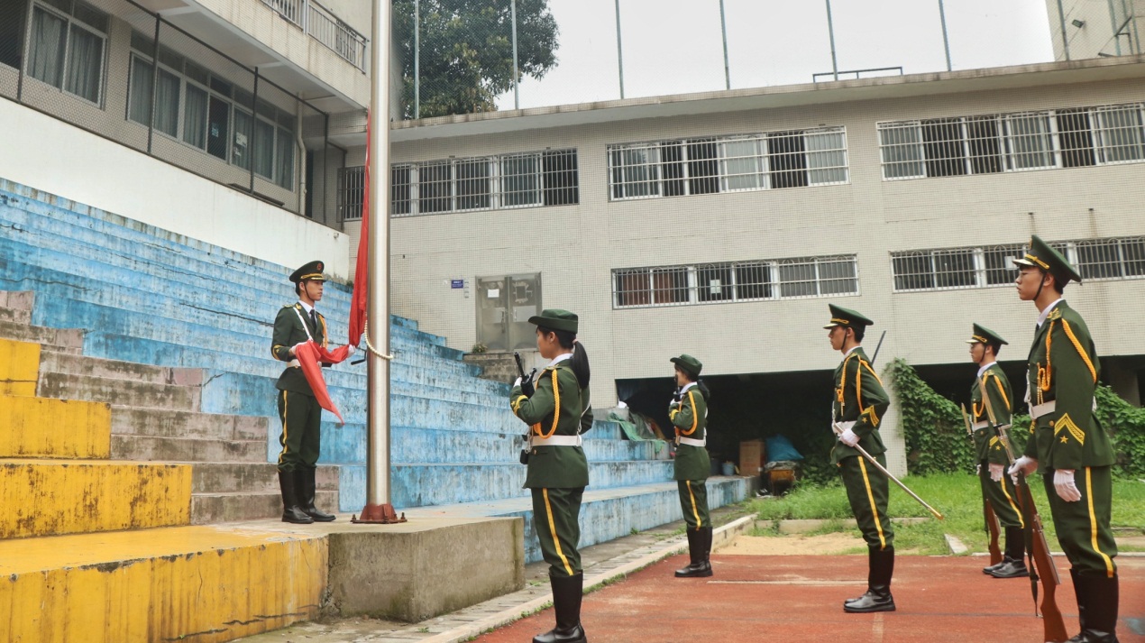 学校国旗护卫队的同学们迈着铿锵有力的步伐,昂首阔步护卫着国旗走向升旗台。“向国旗——敬礼!”口令声响起,雄壮激昂的《义勇军进行曲》响彻校园。师生们列队整齐、激情万丈地齐声高唱国歌。嘹亮歌声中,鲜艳的五星红旗冉冉升起、迎风飘扬。
