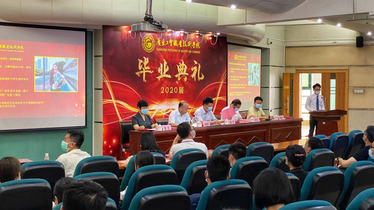 当天下午,学校2020届毕业典礼在学术报告厅举行,我院共33位毕业生代表参加。在温馨的典礼会场,同学们满载着收获的喜悦,洋溢着灿烂的笑容。一时间,线上、线下、校内、校外,所有毕业生同频共振、心意相连。我院17软件3班张顶同学作为毕业生代表发言,张顶感谢了学校老师三年的教导,同时作为一名湖北籍的学生,他表示在疫情中深深地感受到了学校、老师们的关怀,湖北抗疫的胜利更是让他深刻体会到了“国是千万家”的深刻含义。最后,他说:“同学们,马上就要开启新的筑梦之旅了,让我们带着“寻真求是,格物致知”的工贸精神,砥砺前进!”
