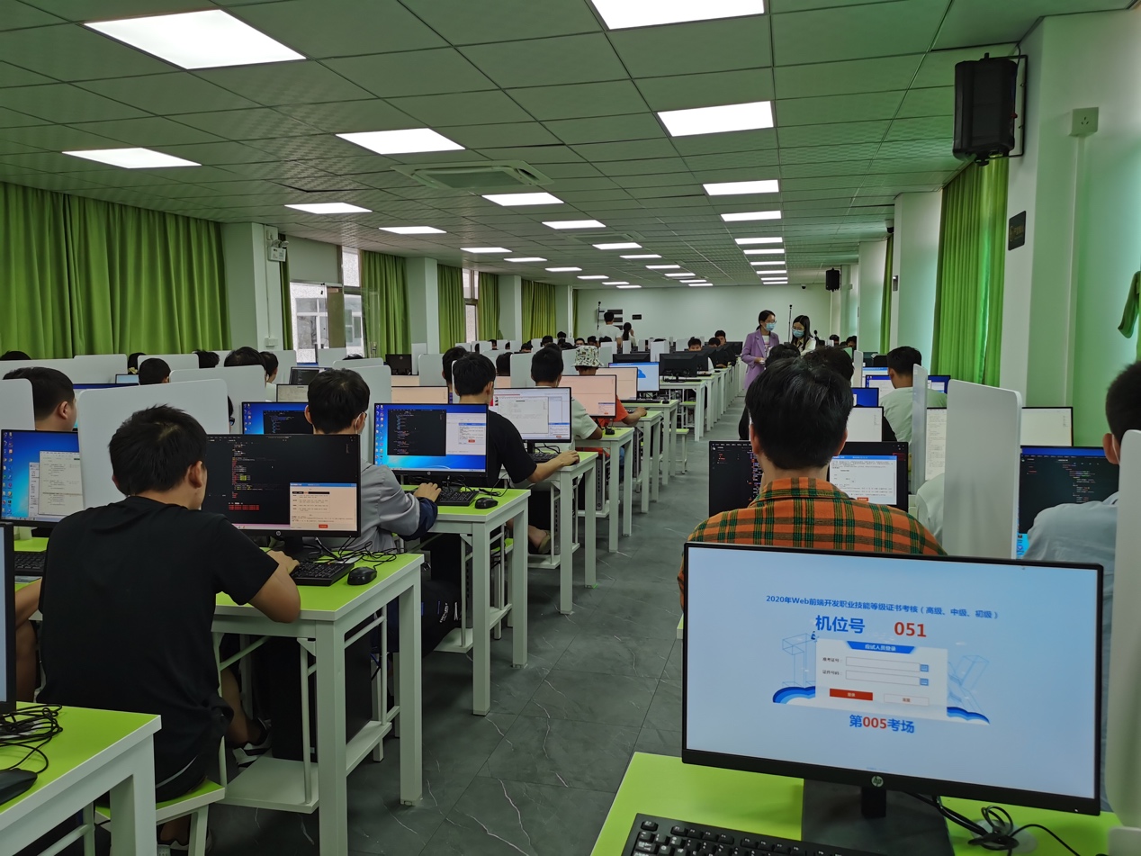 2020年10月17日全国1+x web前端开发职业技能等级考证在新葡的京官网天河校区实训楼展开,参与本次考证的学生为18级软件技术专业学生,共有218人报考,其中初级118人,中级100人。学院领导十分重视1+x职业技能等级考证,为此专门成立了1+x web前端开发考证工作小组,其中主考为院长余棉水,副主考分别为副院长鲁庆、副院长单家凌和软件工程系主任黄培泉,巡考为软件技术专业带头人伍杰华教授,技术保障人员为陈洲唤和雷铭云。本次考证从9月15日开始筹备,考证工作小组做了大量的工作,软件工程系在9月22日-9月28日组织了一次为期一周的web前端开发考证实训,从北京请来web前端考证标准制定人员之一的何韬教授为学生做考前指导。同时,软件工程系老师们动员学生报名、收集考证学生的报名信息和照片、技术人员带领在实验室勤工助学的学生处理各种数据、验证考试报名信息、机房软件安装与调试、服务配置、网络测试等。在考前不断与工信部技术员沟通,并做了两次大规模的全员考证测试,负责的老师们常常工作到凌晨3点。充足的准备保障了考证工作得顺利进行。