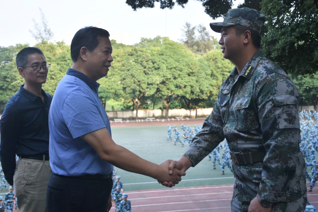 10月22日,学校党委副书记、校长何汉武教授在天河校区检查指导2020级学生军训。学生军训团天河校区负责人程国柱、学校办公室主任吴浩、学生处处长刘建军、计算机学院院长余棉水、体育艺术教学部吴云、学生处副处长许斯华、计算机学院党总支副书记张艳等陪同。