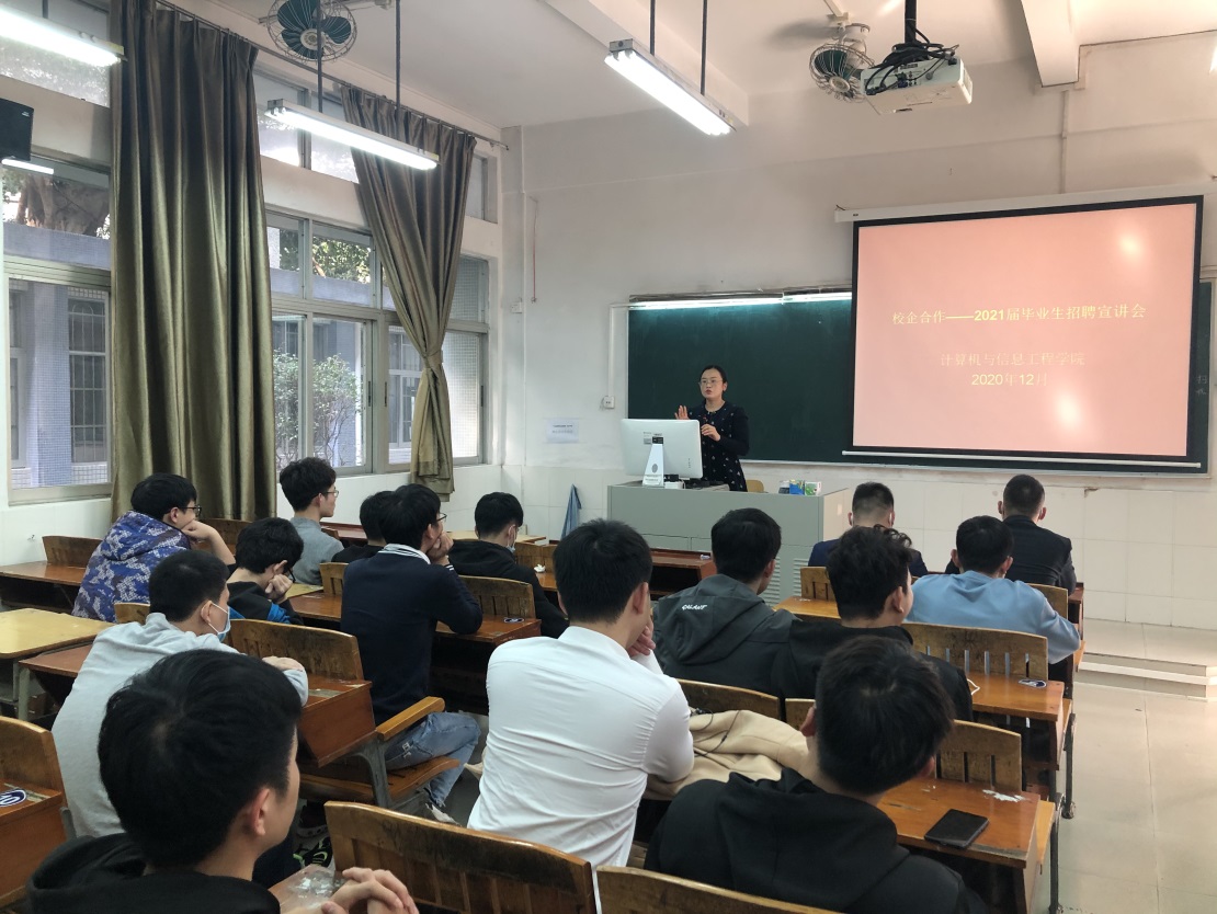 2020年12月29日下午两点半,计算机学院在学校天河东区教学楼面向2021届毕业生举行了专场招聘宣讲会。计算机学院党总支副书记张艳会见了来校招聘的企业代表并向参加宣讲会的毕业生作了就业动员讲话。