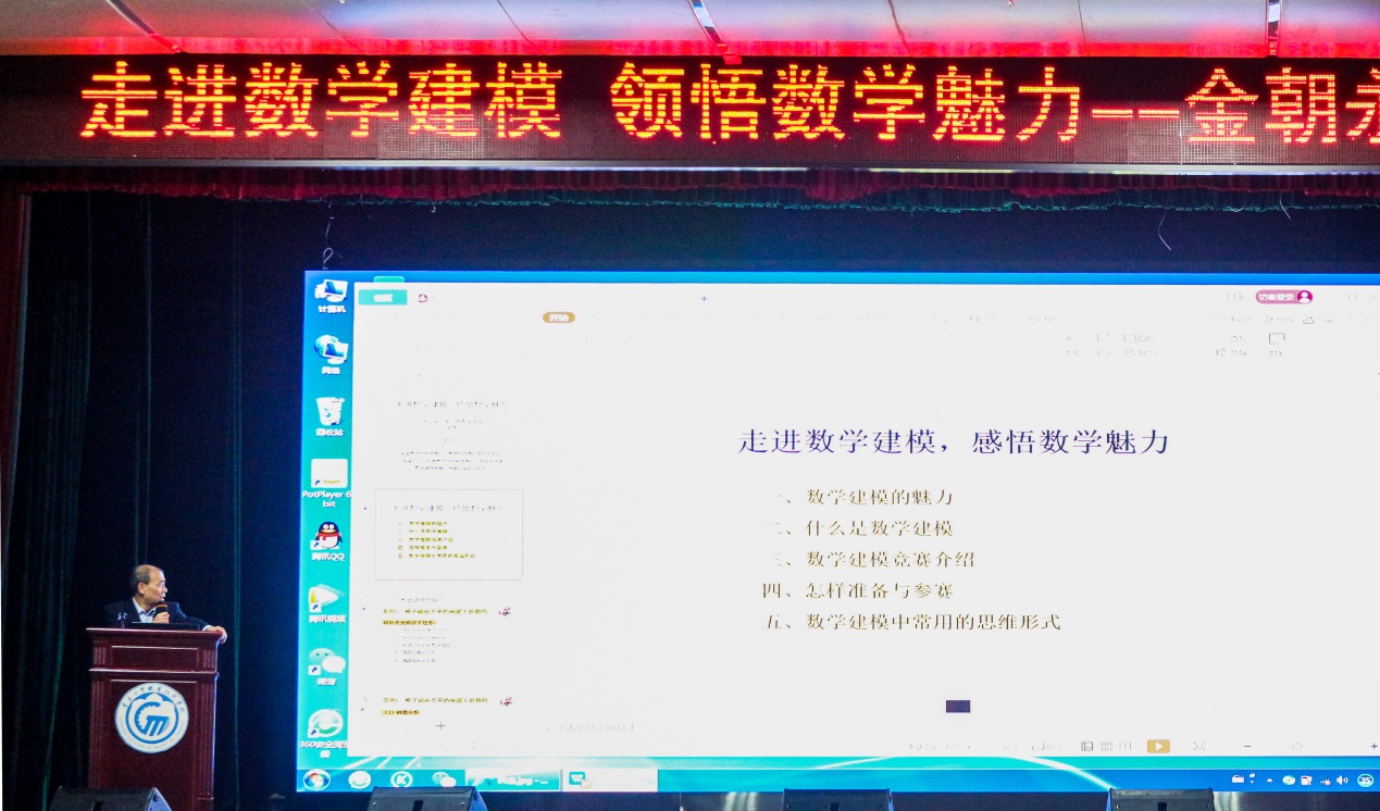 为普及数学建模基础知识,让同学们进一步了解什么数学建模及数学模型在日常生活当中的作用。学校团委邀请了来自广东工业大学金朝永教授,开展了“走进数学建模,领悟数学魅力”的讲座。学校团委书记陈冠锋、计算机学院党总支书记张宁、党总支副书记张艳、副院长鲁庆、全体数学老师,以及200余名同学共同聆听了讲座,同时对本次讲座在腾讯直播上进行了直播。