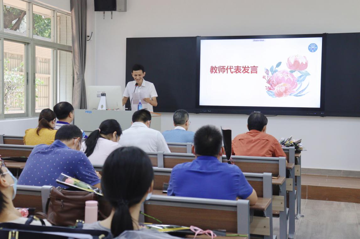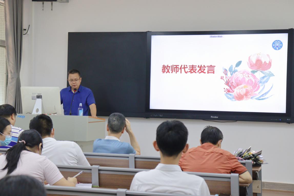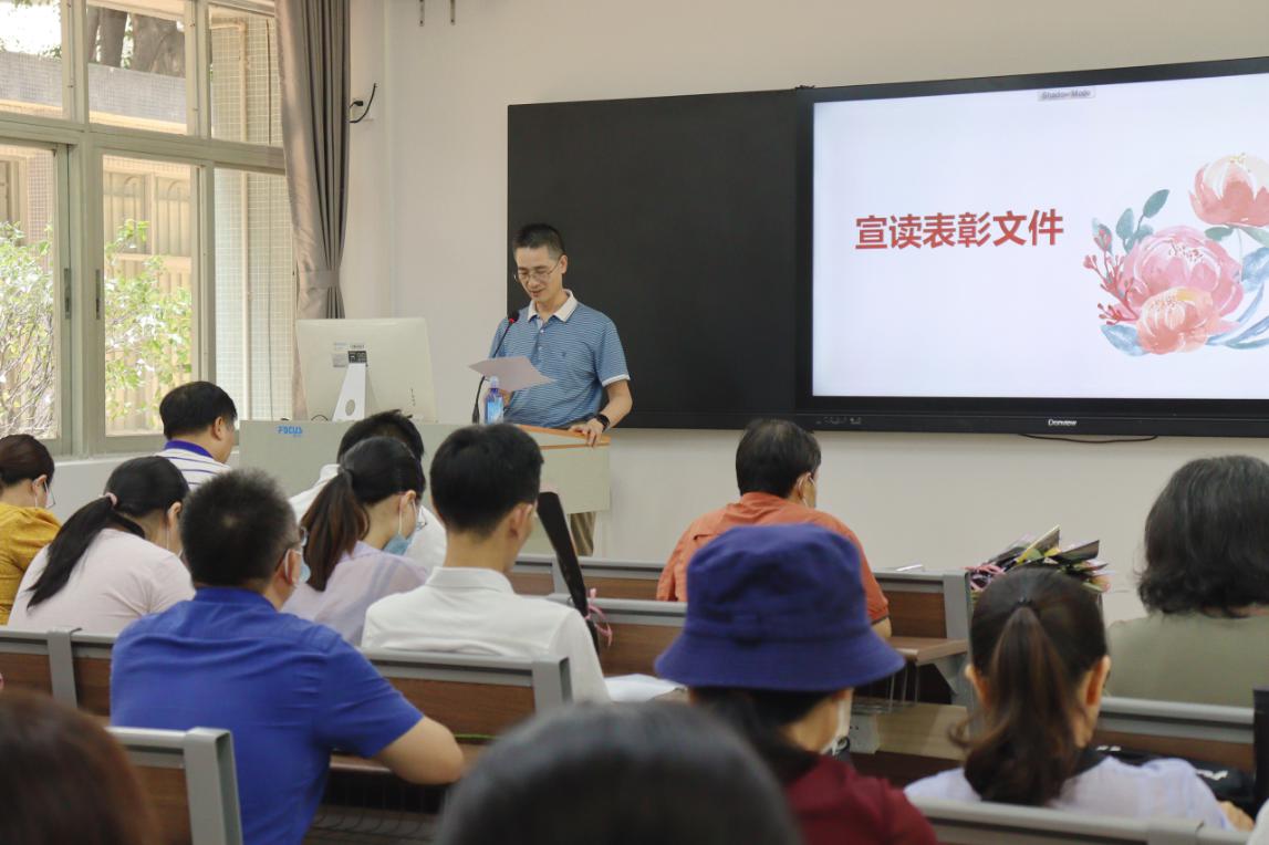 庆祝大会由计算机学院党总支张宁书记主持。张宁书记首先向全体教师送上节日问候并致以崇高敬意。他表示步入新学年,学校正在规划“十四五”规划的新蓝图,致力于推动教育事业高质量新的发展,师资队伍不断加强,计算机学院教师大家庭又多了10 多张新面孔,为学院的发展壮大带来了生机和活力。随后,计算机学院余棉水院长上台宣读了有关表彰文件,他对获奖的教师表示祝贺,并号召大家向他们学习,继续争先创优。
