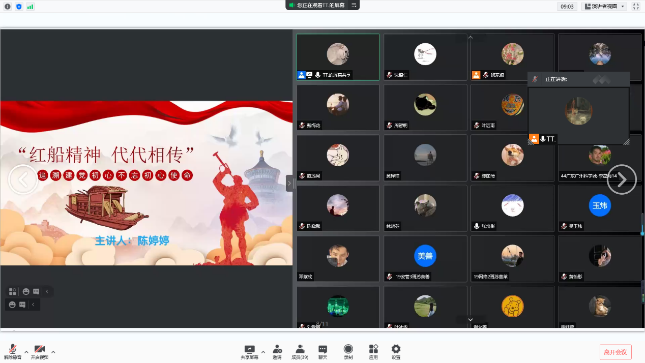 9月7日下午14:00,校学生党史宣讲团成员陈婷婷同学采用通过腾讯会议的形式为计算机与信息工程学院20数媒1班开展了线上党史宣讲活动。在本次专题学习活动中,陈婷婷同志带领团支部同志,学习了习近平总书记在庆祝中国共产党成立100周年大会上的重要讲话精神,并以“红船精神,代代相传”为主题展开了党史知识的宣讲,团支部全体同学参加。