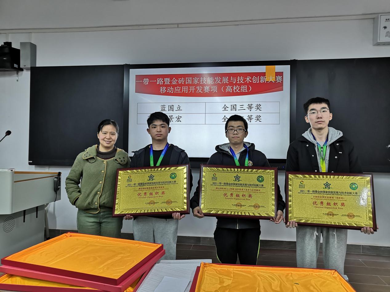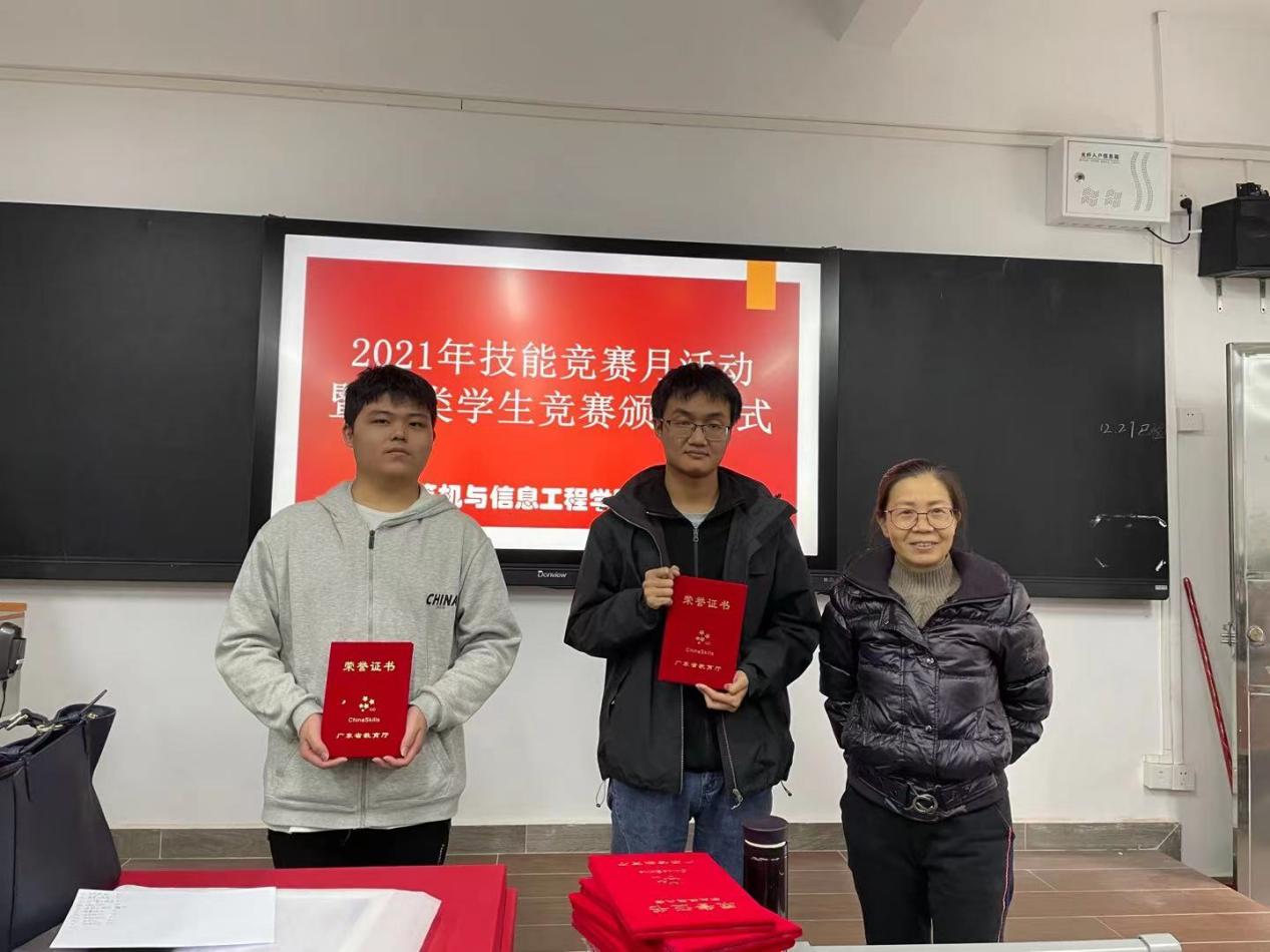 活动中,老师们给参加各类技能竞赛获奖的同学进行颁奖,2021年软件工程系学生共有200多人次参加了各类竞赛,具体包括:省职业技能竞赛软件测试赛项、Web应用软件开发赛项、融媒体内容制作赛项、移动应用开发赛项、块链技术应用赛项、小程序设计与开发赛项;2020-2021年度区块链技术应用行业技能竞赛;第十二届蓝桥杯全国软件和信息技术专业人才大赛省赛国赛;2021年广东省职业院校赛证通融邀请赛-“东软杯”商务软件解决方案竞赛;一带一路暨金砖国家技能发展与技术创新大赛小程序应用与开发赛项(高校组);一带一路暨金砖国家技能发展与技术创新大赛移动应用开发赛项(高校组);一带一路暨金砖国家技能发展与技术创新大赛人工智能协作机器人技术与应用赛项(佛山国际赛);一带一路暨金砖国家技能发展与技术创新大赛移动应用开发赛项(佛山国际赛);第十六届“挑战杯”广东大学生课外学术科技作品竞赛;Web前端设计与开发大赛;大学生程创新创业序设计大赛;大学生创新创业软件开发大赛。获奖达到130人次,取得了不错的成绩。