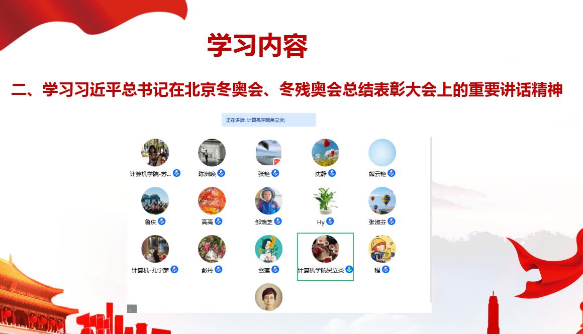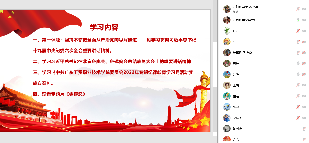 2022年4月19日,计算机学院教师第二党支部按照学校的工作安排及党总支的要求,结合疫情防控需要,组织支部所有党员以线上的方式召开了政治学习活动。