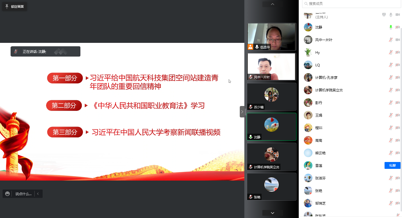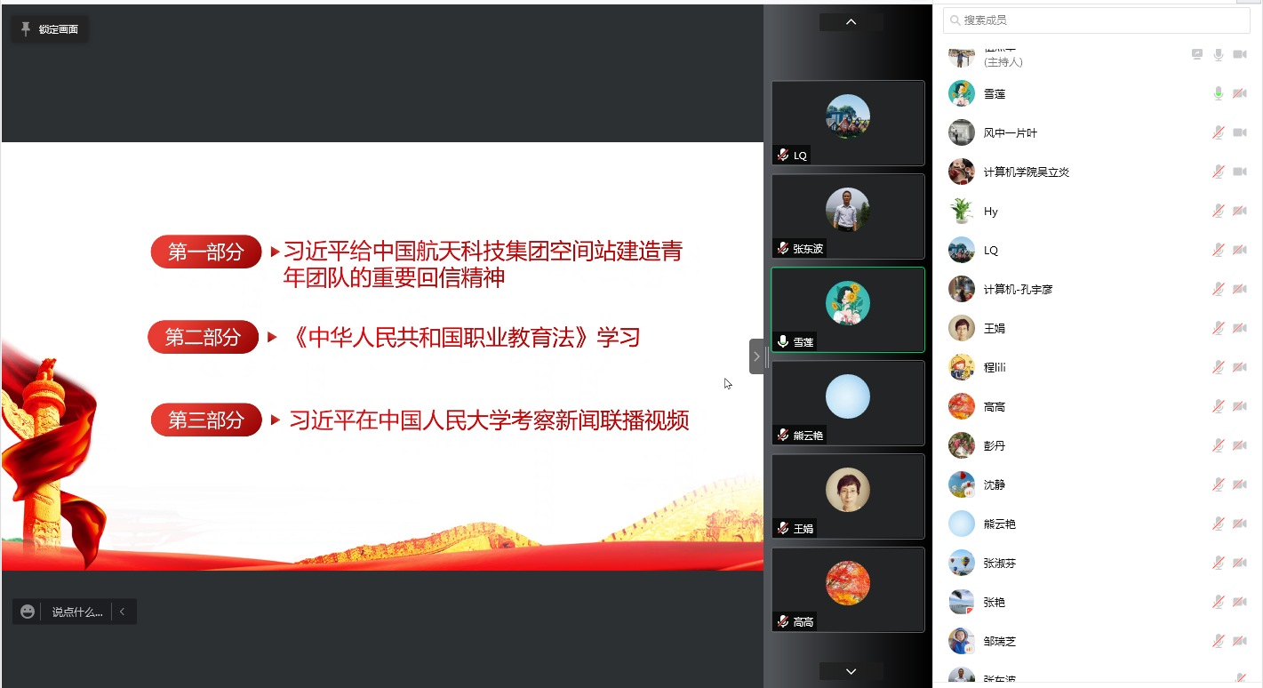 5月17日,计算机学院教师第二党支部按照学校的理论学习要求及学院党总支的部署,结合疫情防控需要,组织支部所有党员以线上的方式召开了政治理论学习会议,学习贯彻习近平总书记给中国航天科技集团空间站建造青年团队的重要回信精神、《中华人民共和国职业教育法》(以下简称《职业教育法》)、观看习近平总书记在中国人民大学考察时的新闻联播视频,深刻领会了习近平总书记重要讲话精神的重大意义,明确了要以“两弹一星”精神、载人航天精神,紧依《职业教育法》的指引,勇于创新突破,承担起 “为党育人、为国育才”的使命,。